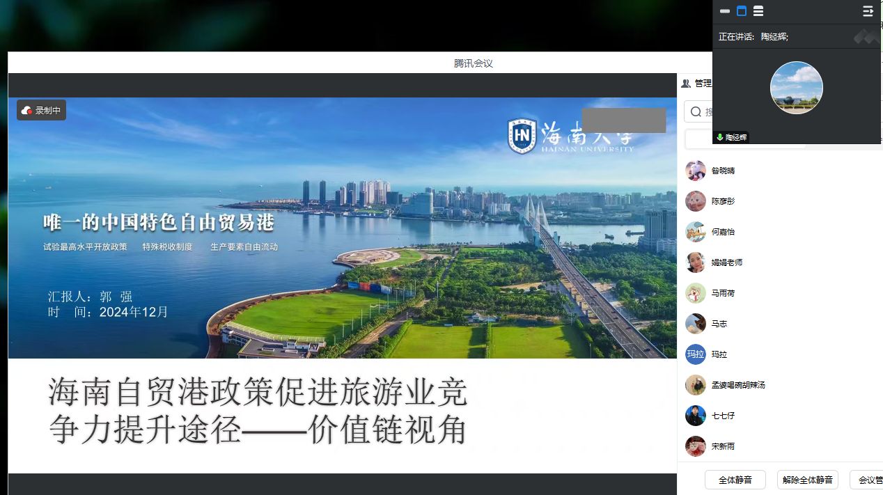 讲座中郭强深入解析了中国特色自由贸易港的概念,指出海南自贸港作为全球最高水平的开放形态,具有独特的地理位置与政策优势。郭强教授强调,自2020年国家出台自由贸易港建设的总体方案以来,海南自贸港在推进贸易自由、投资便利等方面取得了显著进展,并明确了未来的发展规划和时间节点。同时郭强教授还详细讲述了海南自贸港的产业发展和旅游资源的深度融合策略。他指出,海南自贸港并不局限于转口加工贸易,而是致力于发展以旅游、现代服务业和高新技术产业为主导的经济体系,并提出了相应的产业政策和扶持措施。此外,郭强教授还强调了海南的生态旅游及资源开发,介绍了海南丰富的生物资源与独特的生态环境,指出这些优势如何为旅游业的发展提供了契机。同时,他还分析了海南在深海探索、文化旅游和餐饮业发展中的潜力。最后,陶经辉院长作总结发言,对郭强教授的精彩分享表示感谢,并鼓励同学们在学习和研究过程中关注海南自贸港的最新动态,勇于探索和创新。