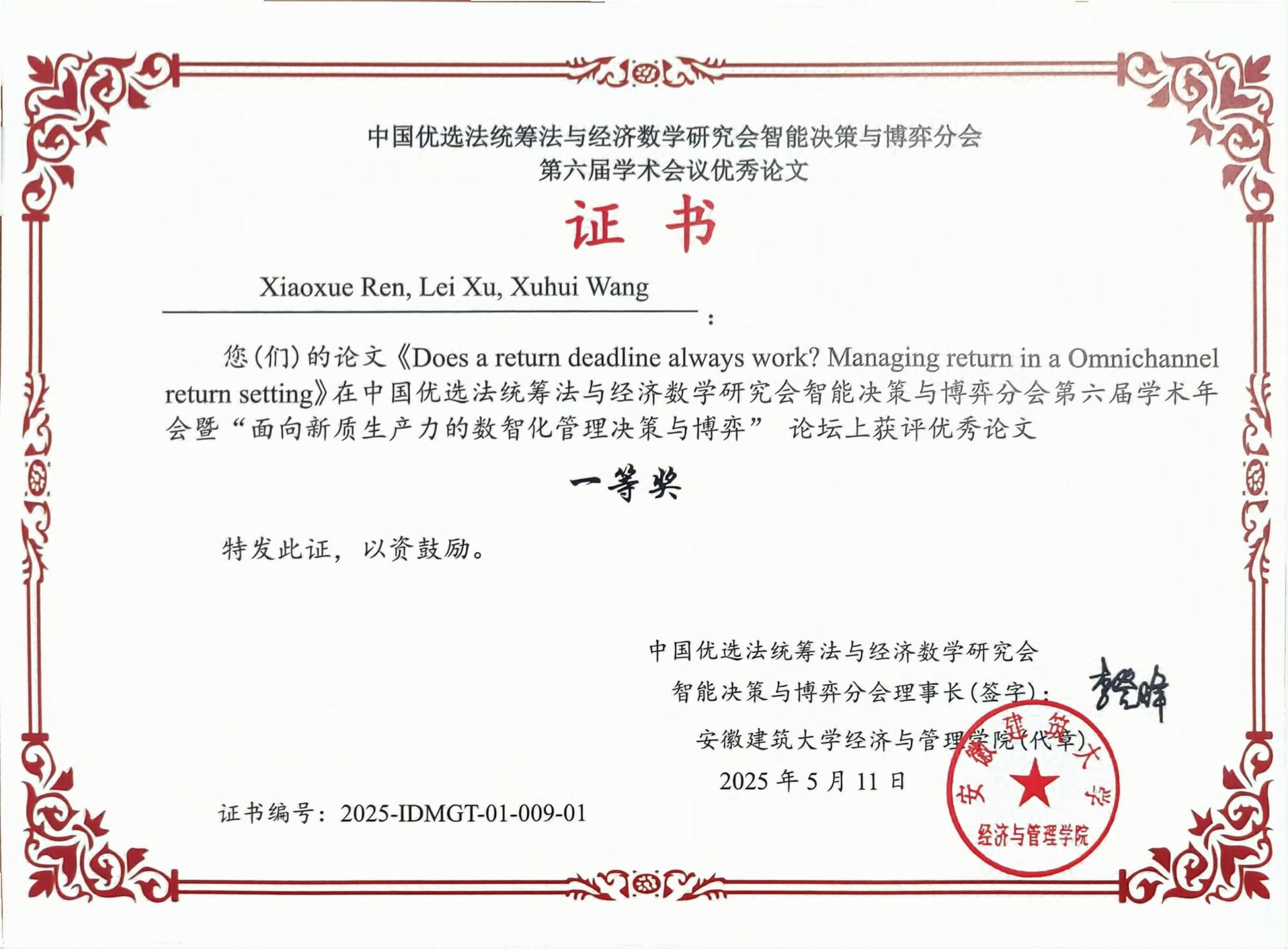我院任晓雪老师在中国优选法统筹法与经济数学研究会智能决策与博弈分会第六届学术年会暨“面向新质生产力的数智化管理决策与博弈”论坛上获评优秀论文一等奖。