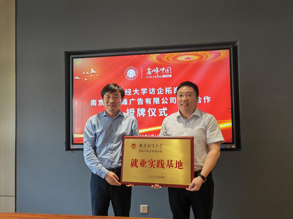 黄建元总会计师授予南京鑫彩峰广告有限公司(集团)“就业实践基地”牌匾,朱学峰董事长代表公司接受本次授牌。