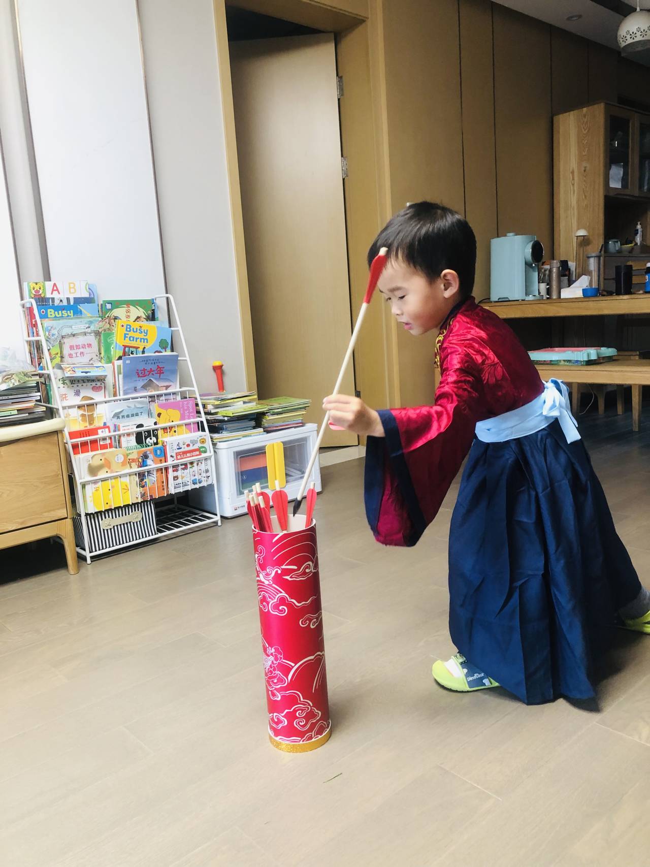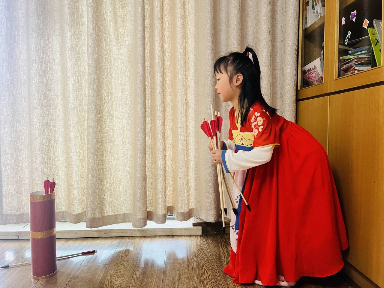 根据疫情防控的要求,此次活动教工子女均在家中身穿汉服,参与投壶这一传统游戏。投壶不仅是一项娱乐活动,还是一项最先从先秦延续至清末的传统礼仪和宴饮游戏。在活动中,只见可爱的宝宝们穿着汉服,专心致志地玩起来,用心体验这跨越千年的"投壶"游戏,玩得不亦乐乎。孩子们在轻松愉快的氛围中感受快乐、体验成功,和爸爸妈妈一起度过了一个幸福难忘的六一儿童节。