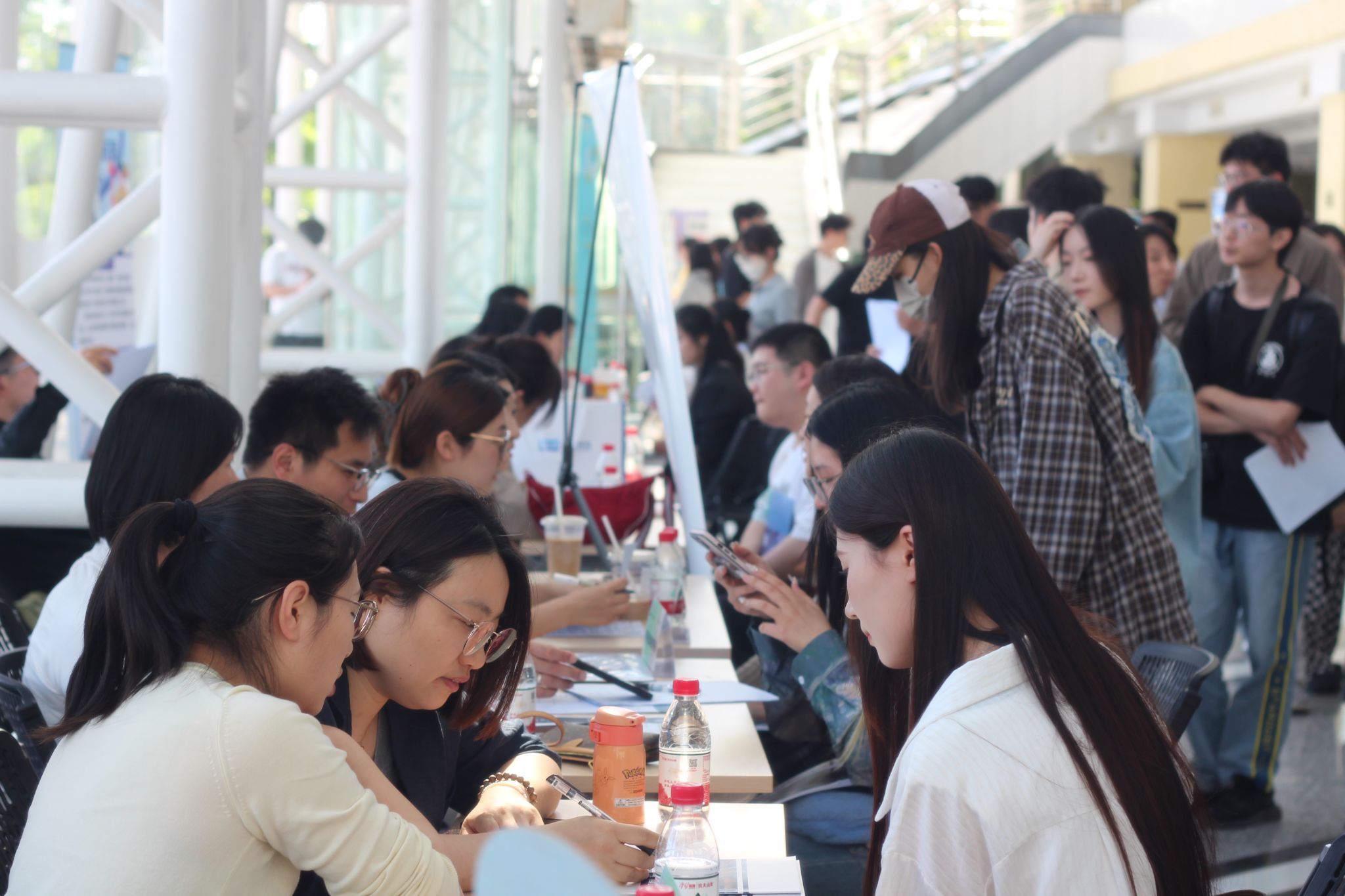 本次招聘会吸引了南京亚欧通讯设备有限公司、江苏先声药业有限公司、江苏大众书局图书文化有限公司、南京银都奥美广告有限公司等27家优质企业参加,涵盖了设计、市场营销、新闻传媒、翻译等多个领域,共提供了超过500个岗位,包括运营管培生、医药营销、外贸客服、游戏建模师、短视频导演等多种类型,充分满足了不同专业毕业生的求职需求。招聘会现场气氛热烈,毕业生们手持精心准备的简历,积极与企业招聘人员沟通交流。他们详细了解企业的发展情况、岗位要求、薪资待遇等信息,并结合自身的专业优势和职业规划,向心仪的企业投递简历。为了更好地服务毕业生,招聘会现场还设置了多个服务区域。政策咨询台为毕业生解答了关于留苏、留宁就业政策以及人才落户等方面的疑问,为他们提供了实用的指导和帮助。