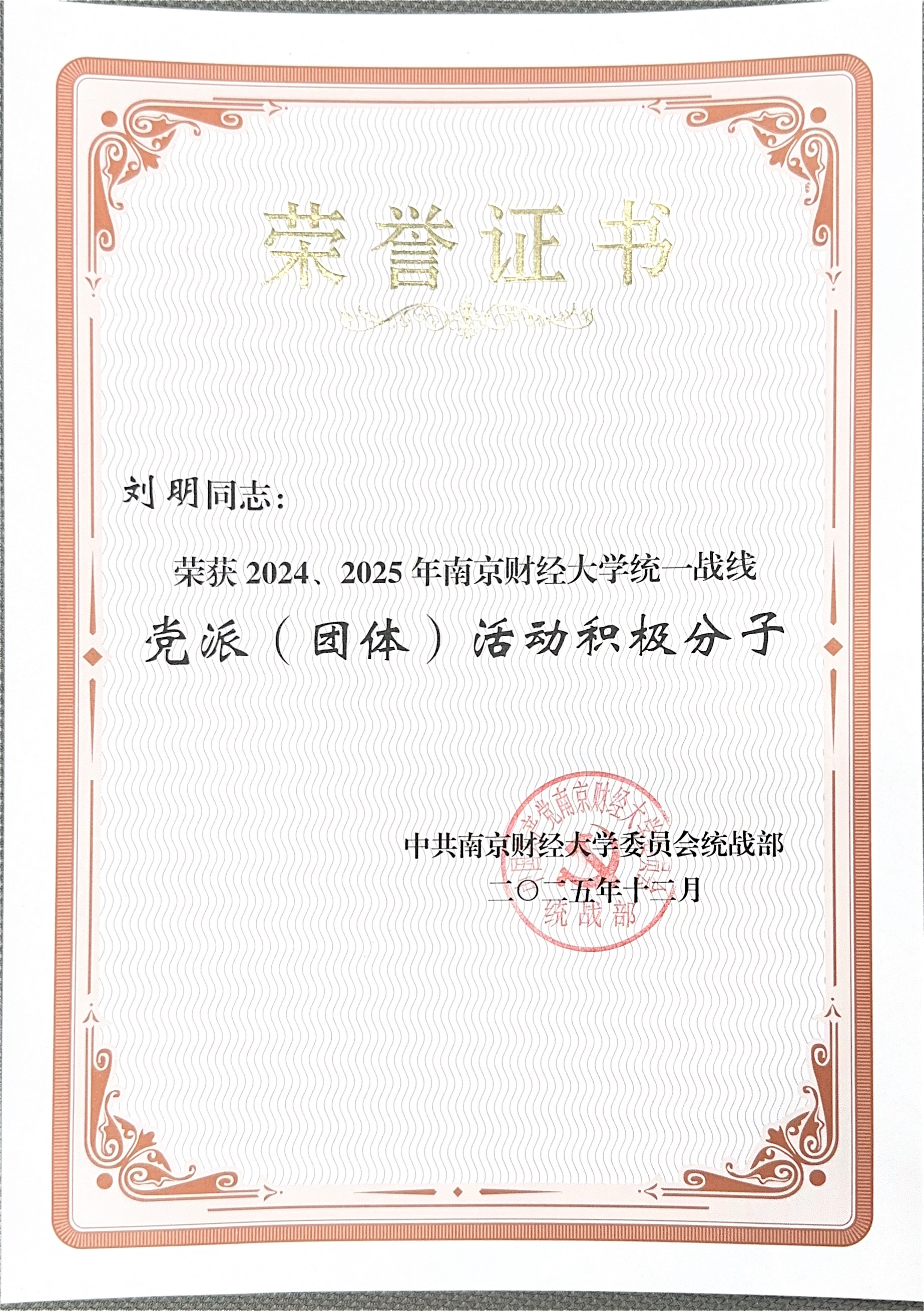 12月22日下午,我校2025年统一战线“同心颂”联谊会在仙林校区图书馆一楼报告厅举办。在此次活动中,我院刘明老师凭借长期积极投身党派活动,以高度的热情与责任心,为学院统战工作添砖加瓦,荣获“党派(团体)活动积极分子”称号。此次获奖,既是对他个人努力的充分认可,更是我院统战工作卓有成效的有力彰显。期待刘明老师未来继续发挥模范作用,推动学院统战工作再上新台阶。