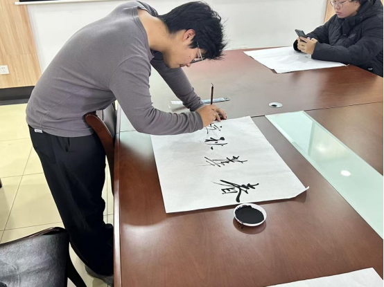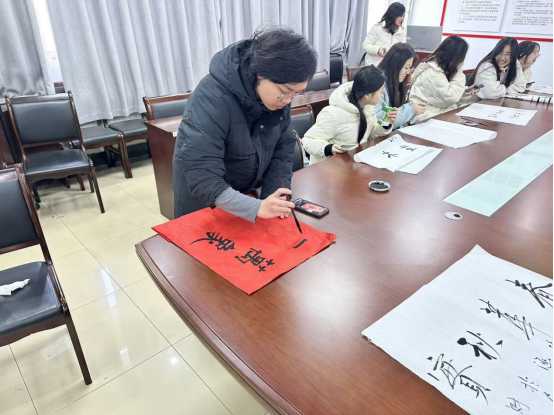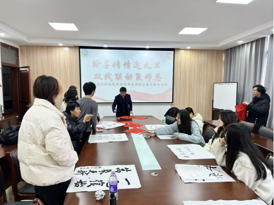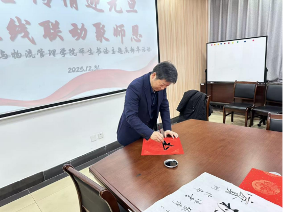线下活动于学院539 会议室开展,笔墨纸砚齐备,师生挥毫书写吉祥祝福、诗词对联,交流笔法心得,现场洋溢着文化气息与师生温情。线上方面,退休老教师居家创作书法作品,以照片形式传递对学院的期盼与学子的关怀,作品与线下佳作同步在线上平台展示,跨越空间凝聚代际情谊。