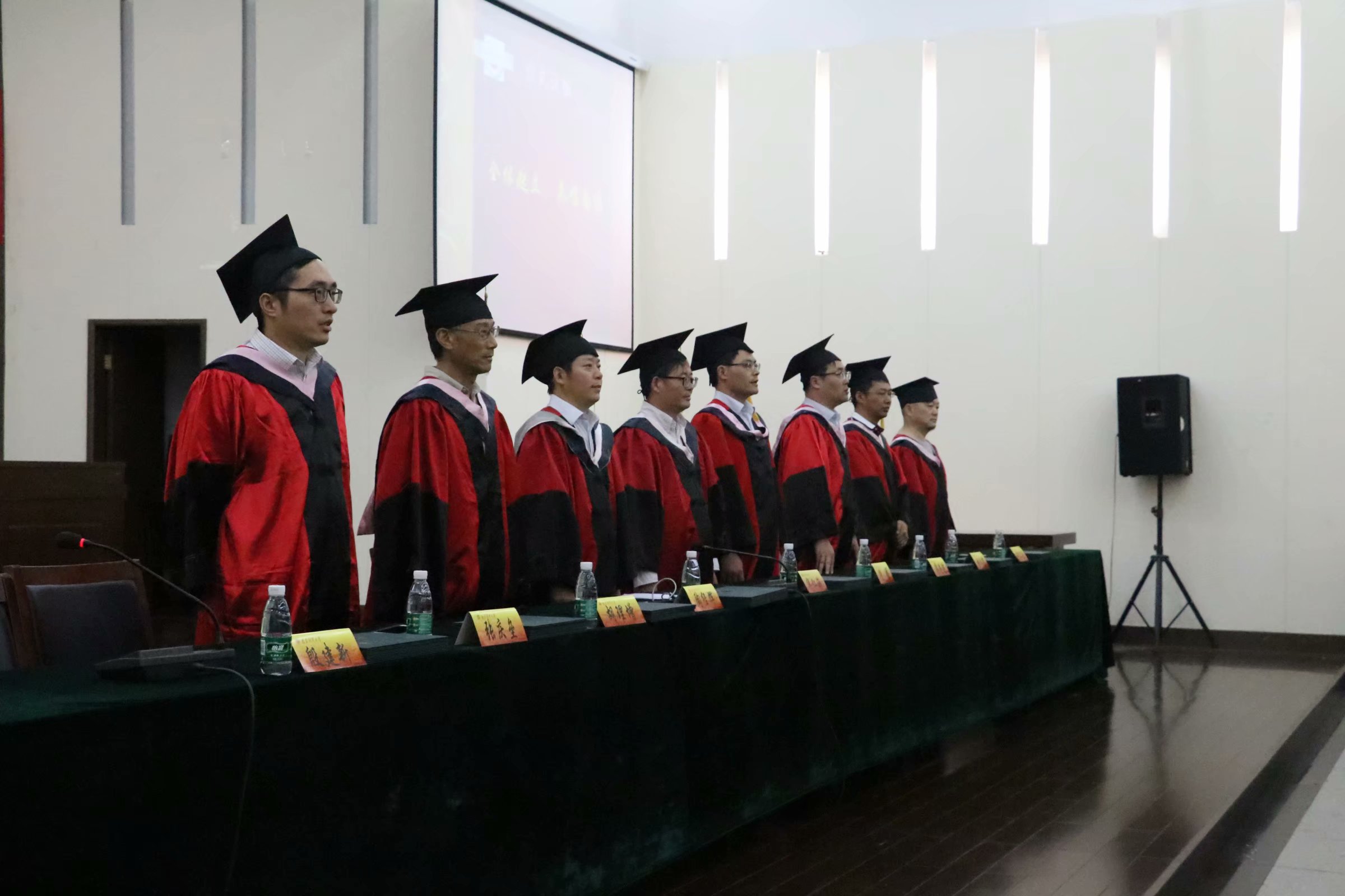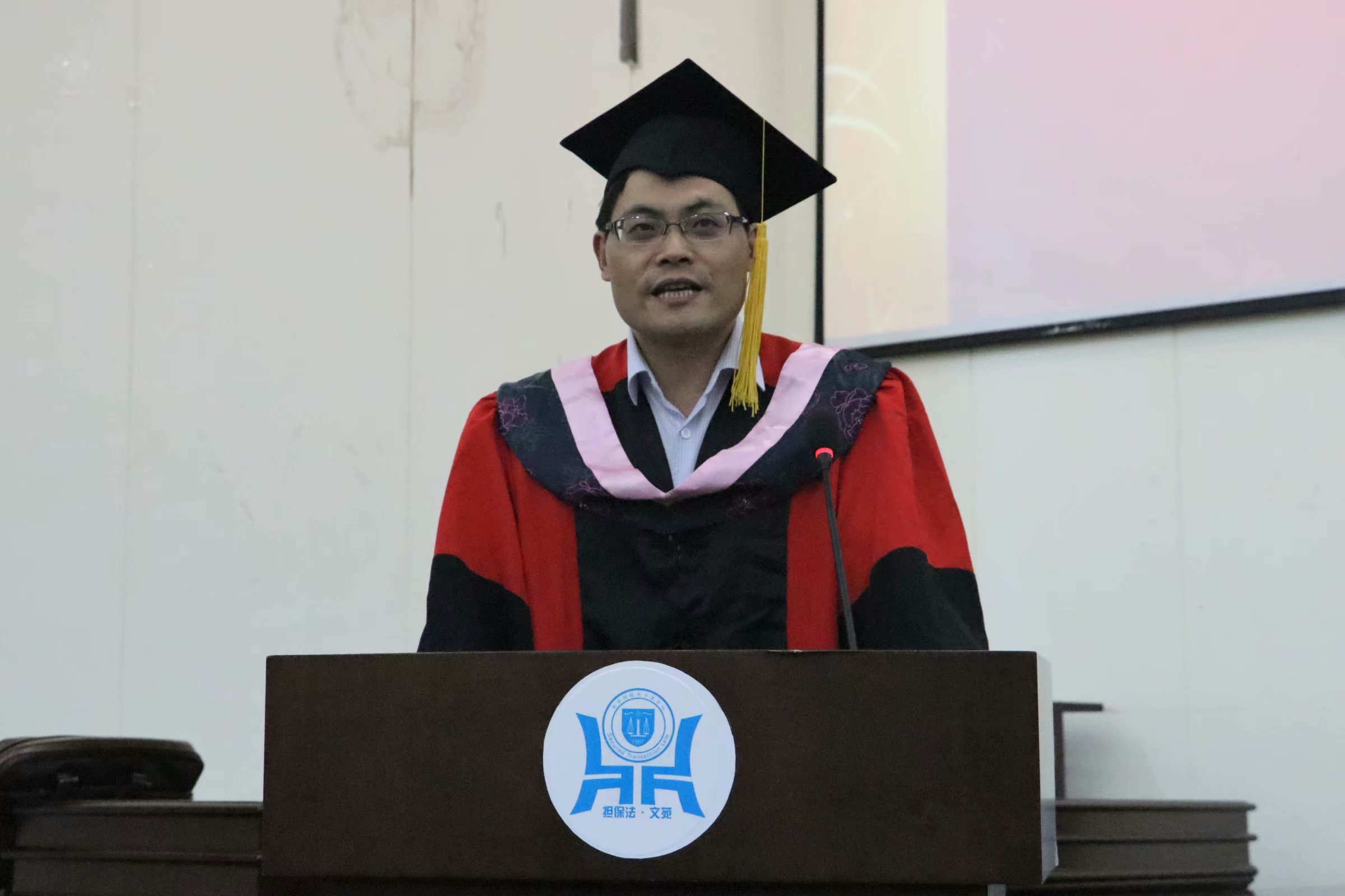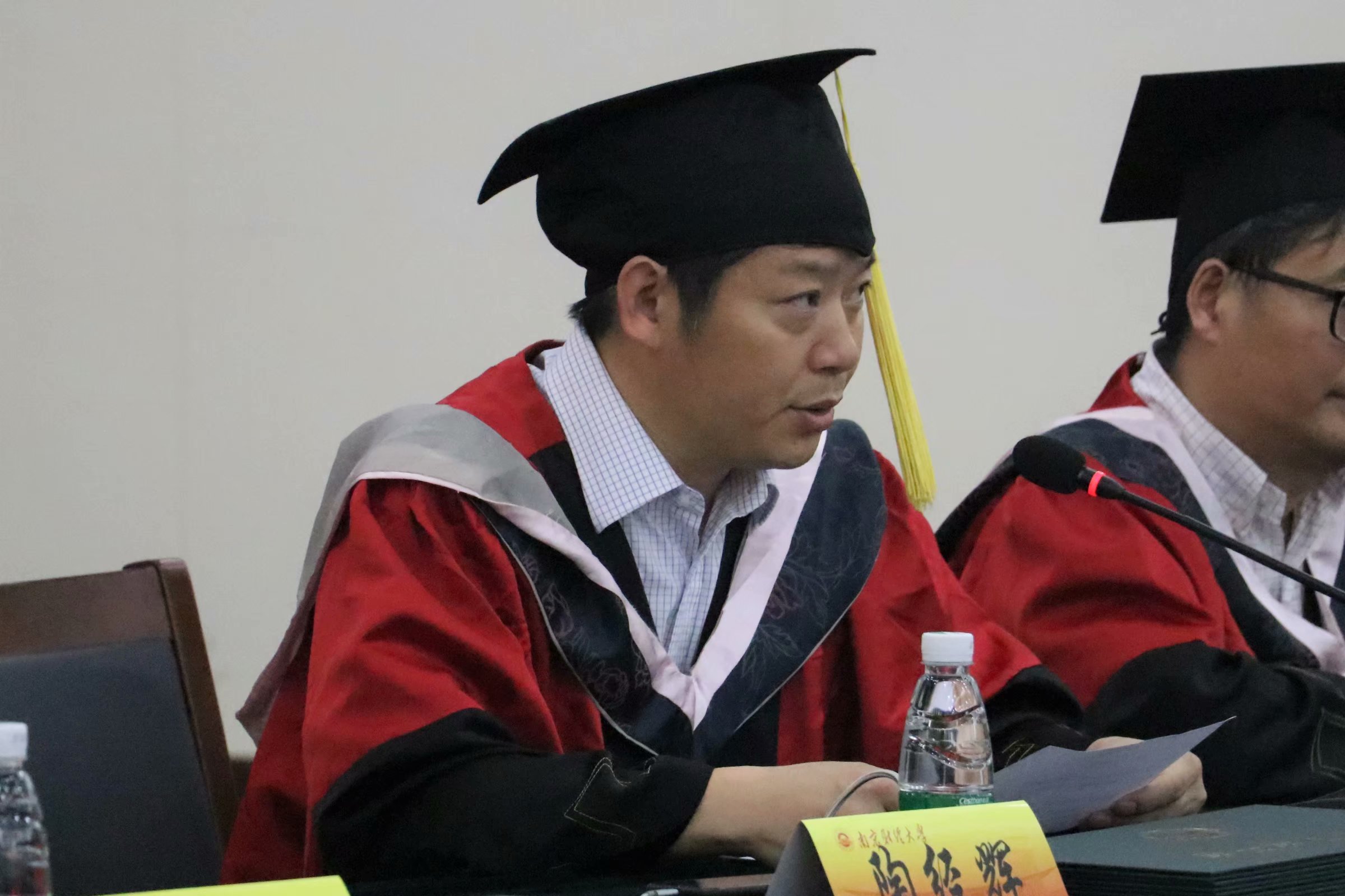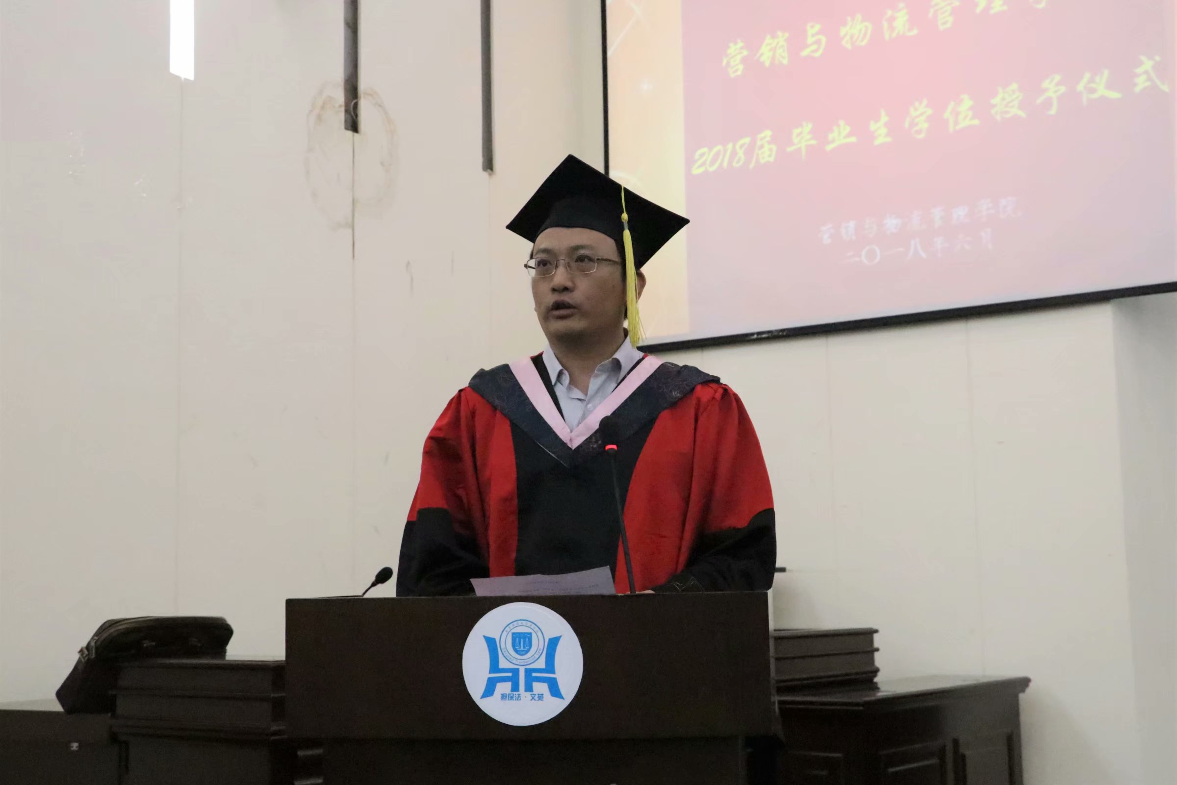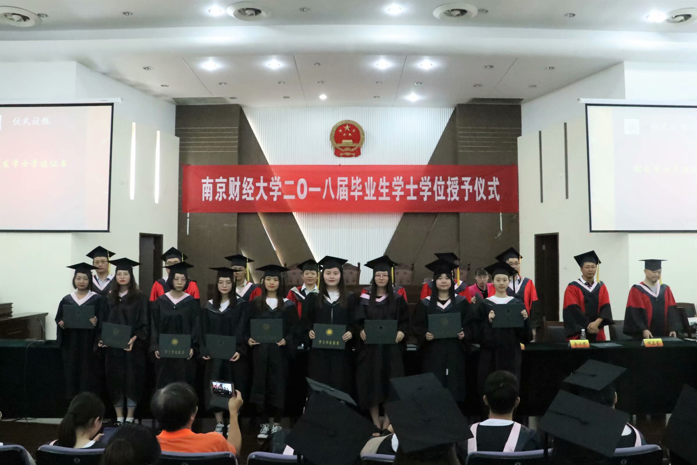 仪式在奏唱《国歌》声中拉开帷幕。首先,院长倪明在热烈的掌声中,发表了题为《从奋斗走向奋斗》的讲话,他向毕业生及其家人们表示最热烈的祝贺,向悉心指导他们的老师表示最衷心的感谢!倪明教授列举了在各个方面表现优异的毕业生代表,带领大家回顾了大学四年成长的点点滴滴,激励全体毕业生们树立奋斗的目标,提高奋斗的本领,在今后的人生道路中坚持学习与实践,将奋斗精神铸入灵魂。倪明教授还悉心教诲同学们千万不要在奋斗的年龄选择安逸,得过且过,做奋斗的观众;务必要做奋斗的演员,从奋斗走向奋斗!接着,副院长陶经辉教授宣读了《关于授予2018届毕业生学士学位的决定》。随后,校领导、学院领导、教授和系主任为241位毕业生颁发了学士学位证书,共同为毕业生拨正流苏,合影留念。
