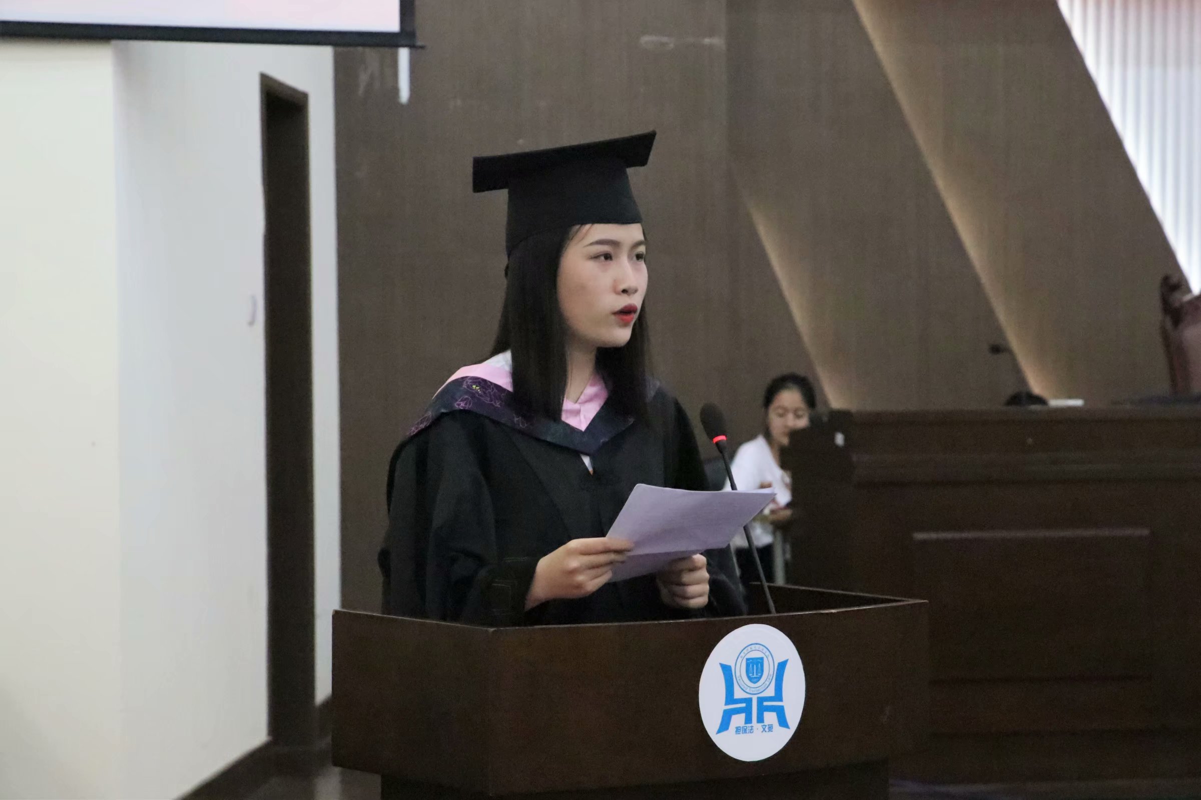 原学生会副主席、广告1402班吕玥同学代表全体毕业生发言,她对母校的栽培和师长的恩德表达了深深的感激之情,并分享了在南财大学习生活的美好回忆。吕玥表示2018届毕业生们将带着“自谦自信,务实超越”的校训服务社会,贡献国家,不懈奋斗!