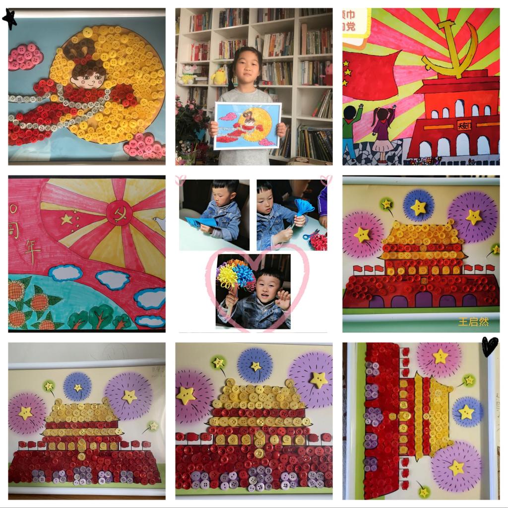 活动受到了孩子们的积极参与,他们用心搭配着不同颜色的纽扣,一丝不苟地装饰着自己的作品。经过小朋友们一番努力,一幅幅主题鲜明、色彩缤纷的纽扣画跃然纸上,有鲜艳的国旗、壮丽的天安门……,他们把自己“热爱祖国、热爱党”的美好愿望融入到自己精心绘制的纽扣画中。一颗颗小纽扣表达了孩子们对党的敬佩和感恩之情,一幅幅手工作品表达了孩子们对党热爱之情和作为中国娃的自豪感。