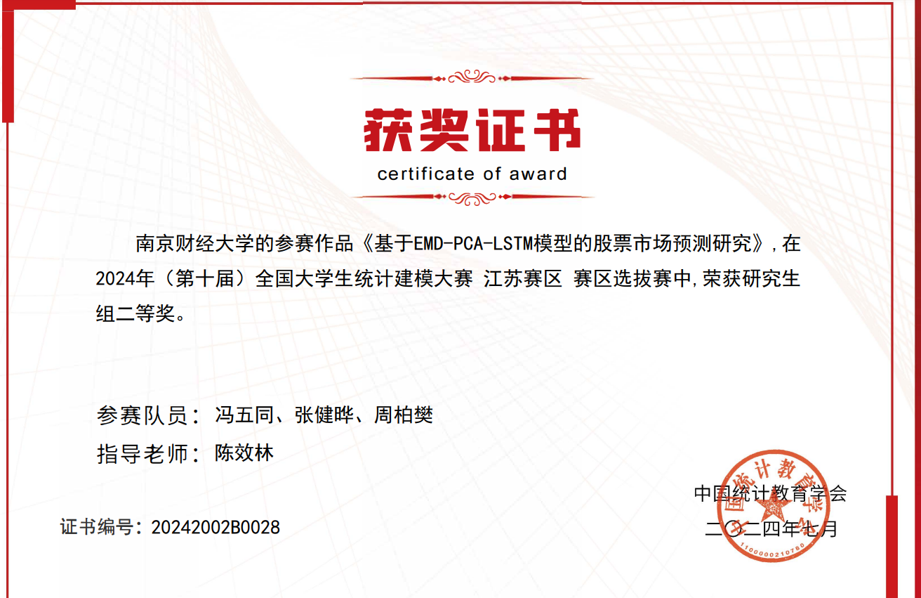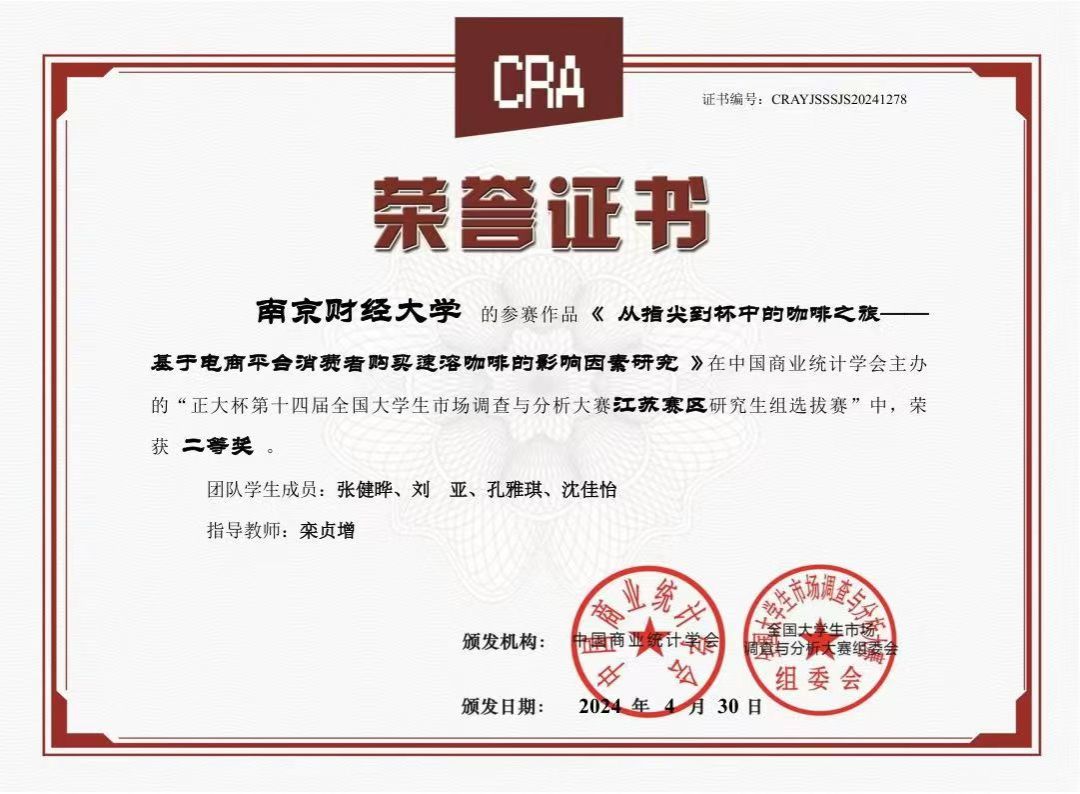 学院研究生教育坚持以服务需求、提高质量为主线,深入实施研究生教育综合改革,不断完善研究生培养质量保障体系,全面推进学院研究生教育内涵式发展。学院积极开展创新工程项目的申报和建设工作,成功申报获批了江苏省研究生工作站,为研究生培养提供优质平台。近年来,学院研究生科研成果丰硕,发表学术论文数篇,多人立项省级研究生科研与实践创新计划项目,多名研究生在“华为杯”中国研究生数学建模竞赛、“正大杯”全国大学生市场调查与分析大赛、全国大学生统计建模大赛、全国高校研究生财经论坛论文大赛等各类比赛中斩获佳绩。此外,还有多名同学获得国家奖学金,以及学校“优秀研究生”、“优秀研究生干部”、“优秀研究生标兵”等荣誉称号。