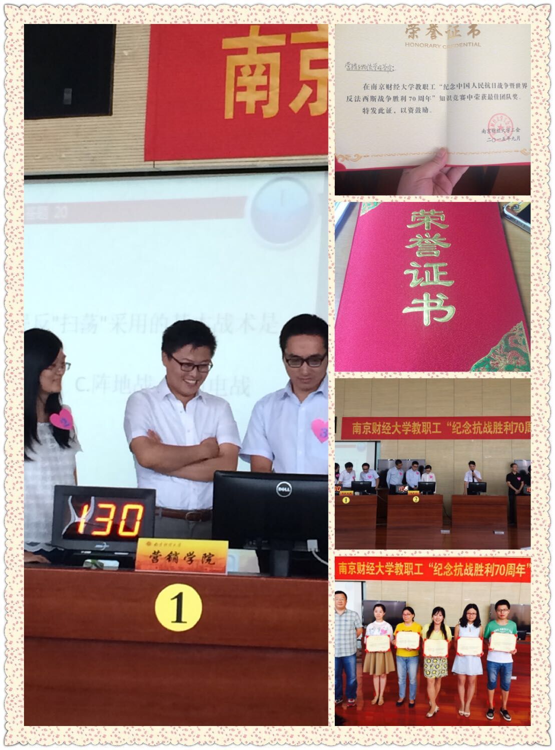 2015年9月9日下午,校工会联合机关党委、图书馆党总支、马克思主义学院党总支在仙林校区图书馆“世界之窗”共同举办伟德国际1946bv教职工“纪念抗战胜利70周年”知识竞赛。我院教师积极参加,并荣获“最佳团队奖”。
