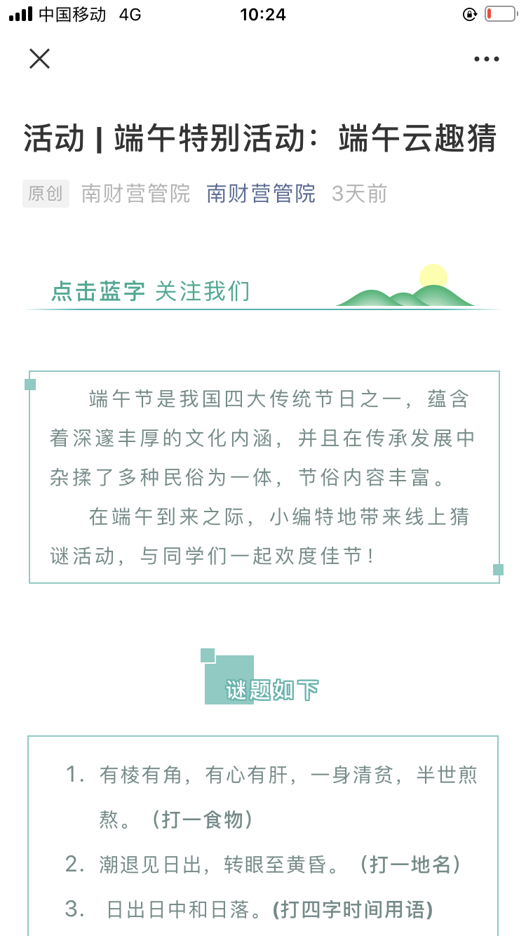 为更好地弘扬中华优秀传统文化,引导师生领悟民族精神,传承民族美德,感受端午节文化内涵,6月17日至23日,院分工会与院分团委联合开展“品味端午·佩香防疫”端午传统文化活动。活动分为线上线下两个环节,线下活动为“营”端午文化游园主题活动,线上环节为端午云趣猜活动。