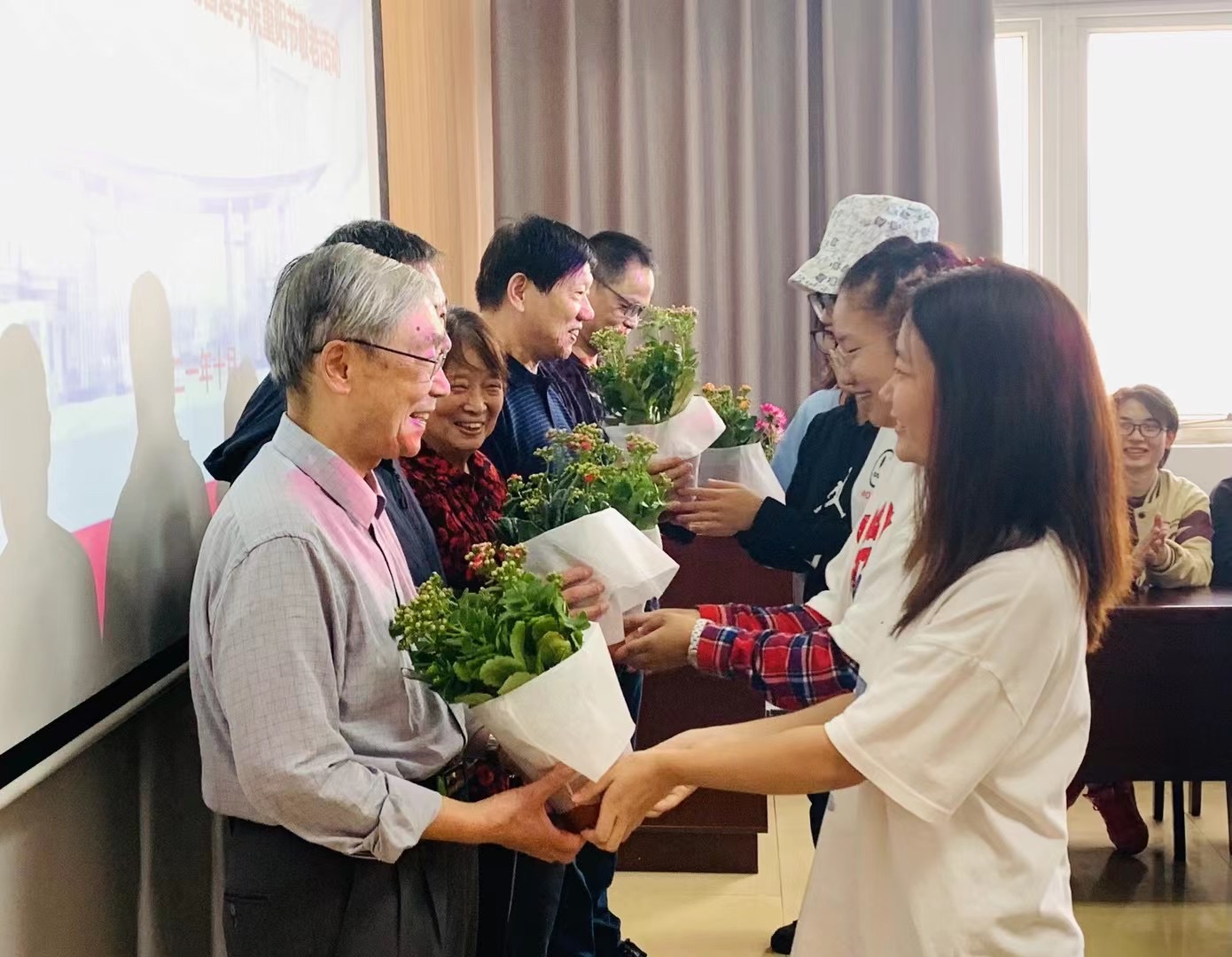 在“薪火相传,继往开来”——重阳节敬老爱老主题交流会上,学生代表为老教师们献上了精心准备的重阳节节目,何卫东老师也为大家表演了京剧经典唱段。老教师们与学生亲切交流,关心学生的学业与生活,与学生一起畅谈大学生涯规划。马承霈老教授还以《学习马克思主义,树立正确的世界观、人生观和价值观》为主题,为同学们带来了一堂微思政课,让同学们在活动中受教育、强信仰,感受老一代教育工作者立德树人的精神品质。最后,本科生代表为退休教师代表献上了长寿花,并进行合影留念,祝愿各位退休老师重阳节快乐,身体安康!