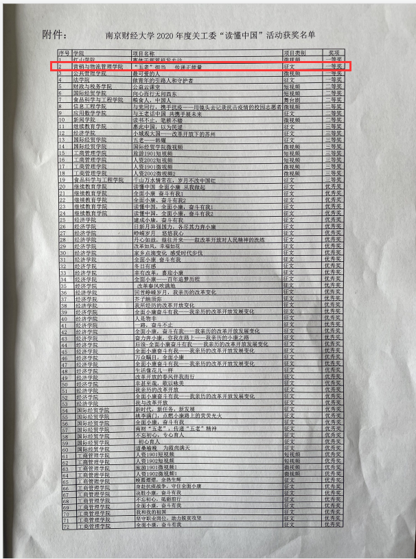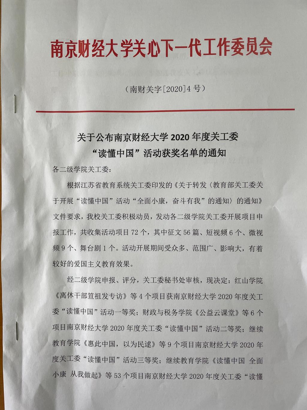 根据《关于转发<教育部关工委关于开展“读懂中国”活动“全面小康,奋斗有我”的通知》文件要求,我院积极动员申报,经校关工委秘书处审核,我院提交的主题征文《“五老”担当 传递正能量》(作者:郎雪青、程志远、单雨宣,指导老师:仲巧林)荣获伟德国际1946bv2020年度关工委“读懂中国”活动征文类一等奖。