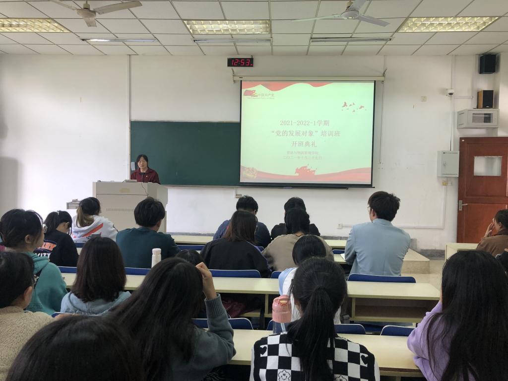 为了切实加强我院学生党员发展工作,使党的发展对象进一步端正入党动机,坚定共产主义信念,10月27日中午,我院2021-2022-1期“党的发展对象”培训班开班仪式于德业楼102举行。党委书记黄建国、各党支部书记以及39名党的发展对象参加了仪式,本科生第一党支部书记仲巧林主持开班仪式。