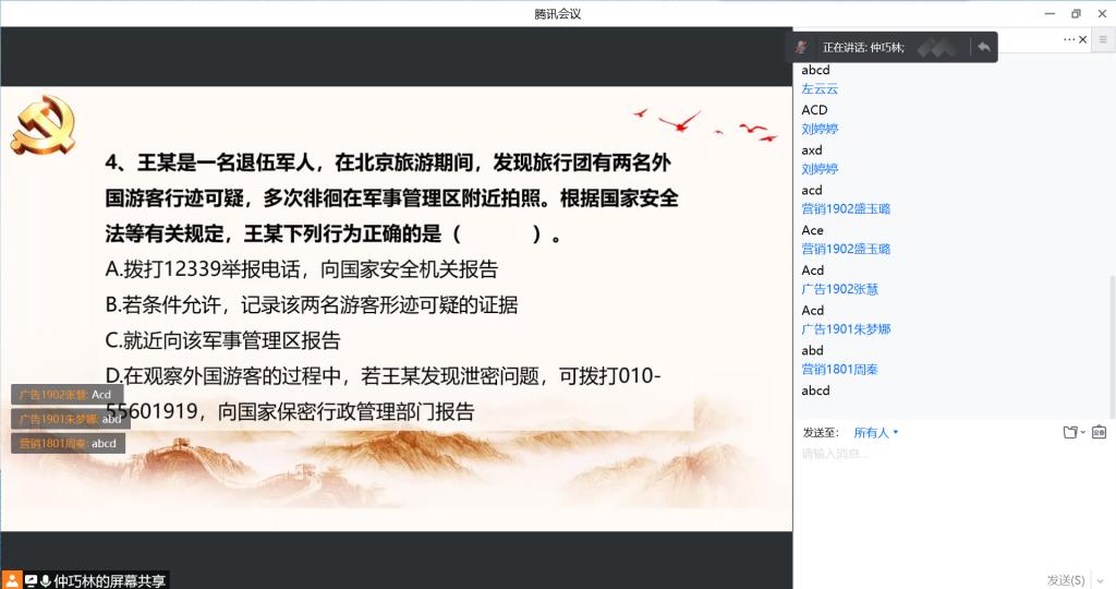 随后,在国家安全知识竞答环节,同学们积极抢答,气氛热烈,并纷纷表示一定会努力学习,遵守法律法规,时刻绷紧国家安全这根弦,切实增强贯彻落实总体国家安全观的政治自觉、思想自觉和行动自觉。