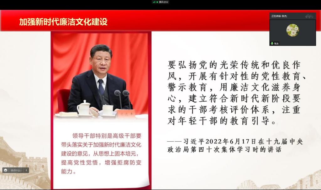 张杰老师从百年党史中的廉洁文化、学生党支部廉政风险点与防控等方面为大家介绍了反腐倡廉的重要意义,并结合勤廉榜样人民公仆焦裕禄、黄文秀等先进事迹,充分展现了共产党人的政治本色,绽放了为民造福的青春光华,师生们深刻感受到了榜样们的廉洁力量和廉洁文化影响的深远。她要求全体师生时刻绷紧廉洁自律这根弦,充分发挥榜样作用,始终做到知敬畏、存戒惧、守底线,保持正直的个人作风。