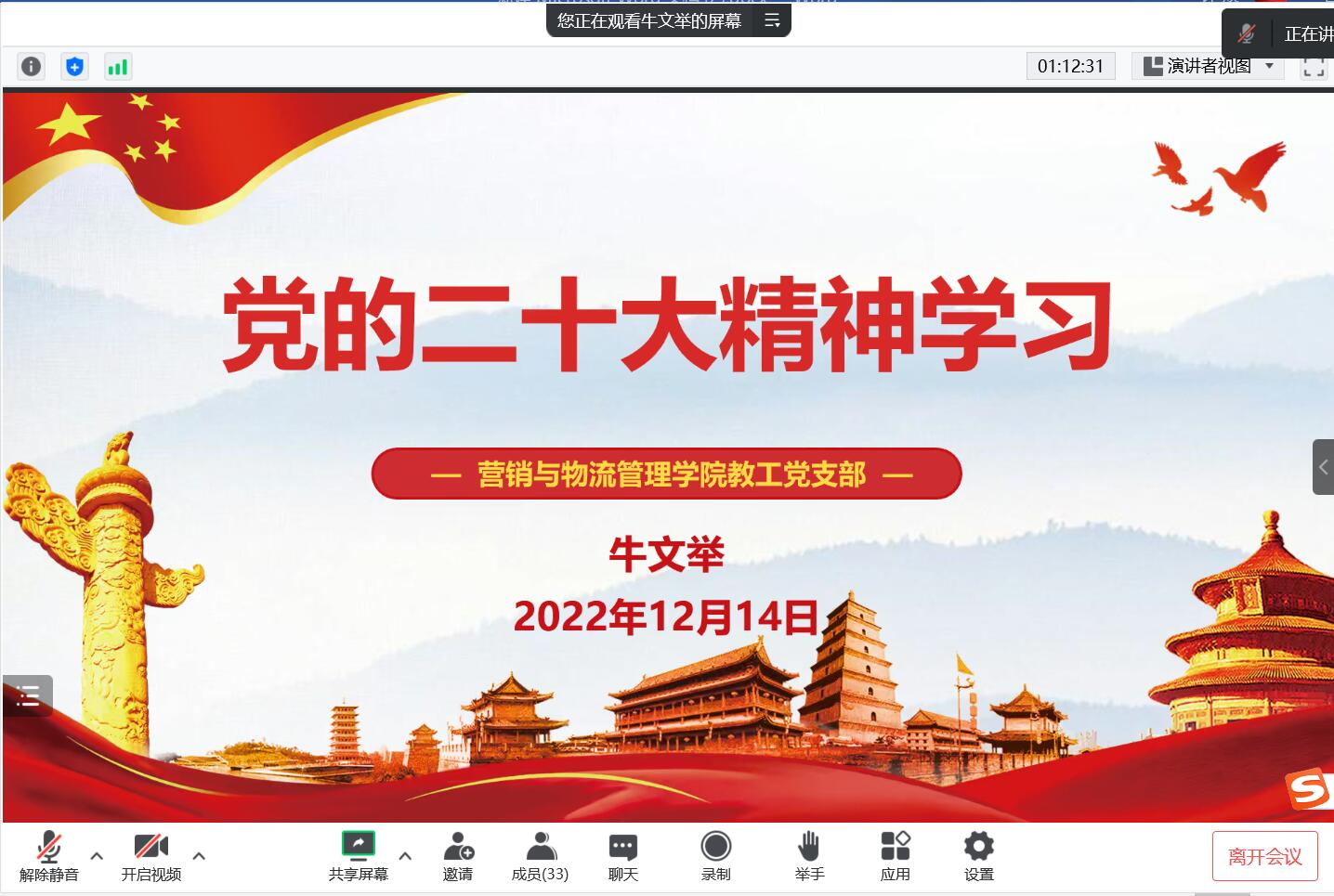 为深入学习贯彻党的二十大精神,深刻领会、准确把握党的二十大的精神实质和丰富内涵,丰富主题党日活动内容。12月14日下午,我院全体教工党员在线上召开了“党的二十大精神”为主题的支部书记讲党课活动。