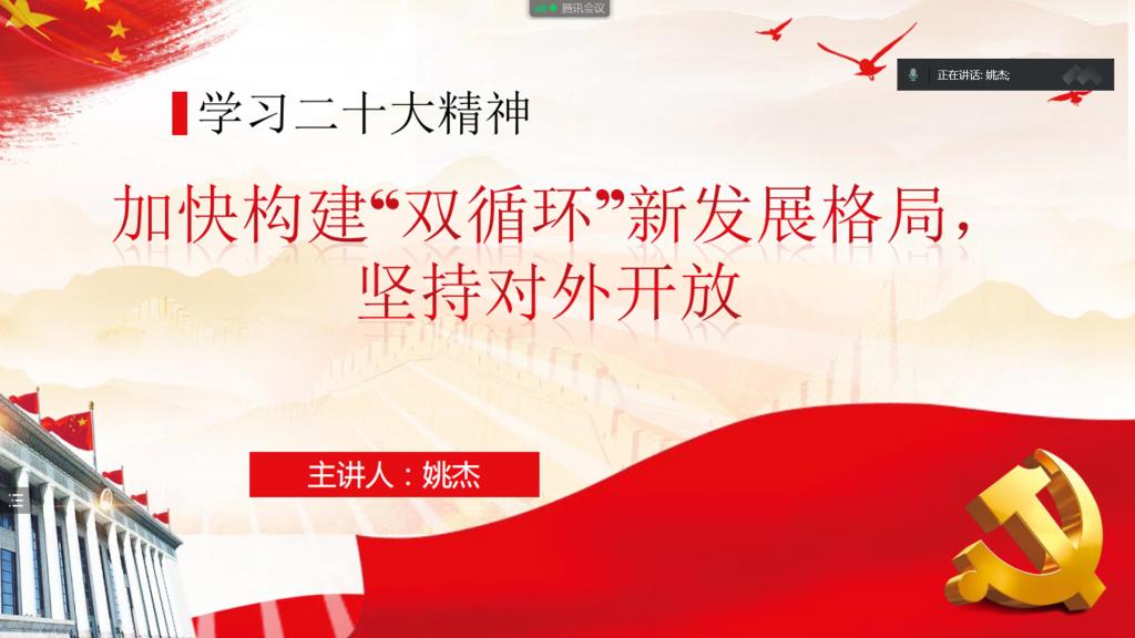 此外,姚杰老师在如何构建高水平的双循环新发展格局指出,需要推动国内国际双循环相互促进,进一步开放市场,用中国庞大的市场推动国际循环。最后,针对双循环经济体系所面临的机遇和挑战,姚杰老师总结道我们需要锻长板,补短板,才能构建“大循环”格局的实现。这对学生党员也是一种启发,在学习和工作中也需取长补短,从而能更快进步成长。