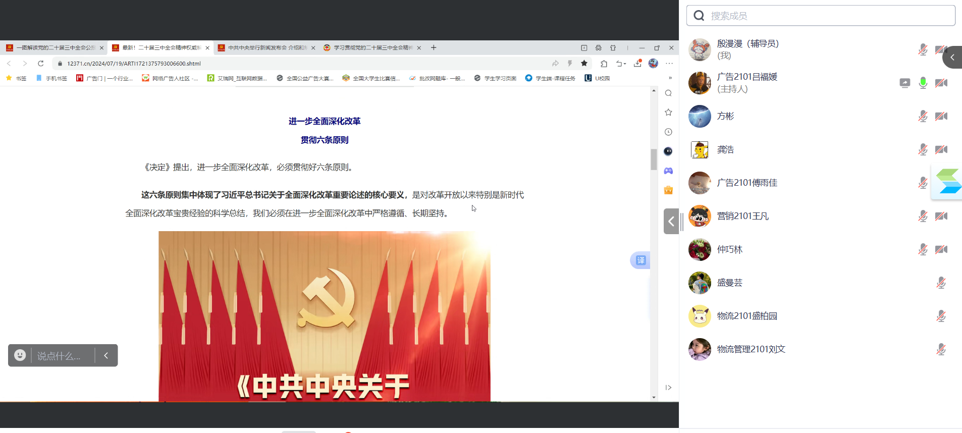 为进一步深入学习贯彻党的二十届三中全会精神,激励支部党员发挥先锋模范作用,推动党支部工作发展,8月10日下午15:00,bevitor伟德国际1946本科生第一党支部召开线上会议,专题学习党的二十届三中全会精神和习近平总书记重要讲话精神。支部全体党员参加学习。