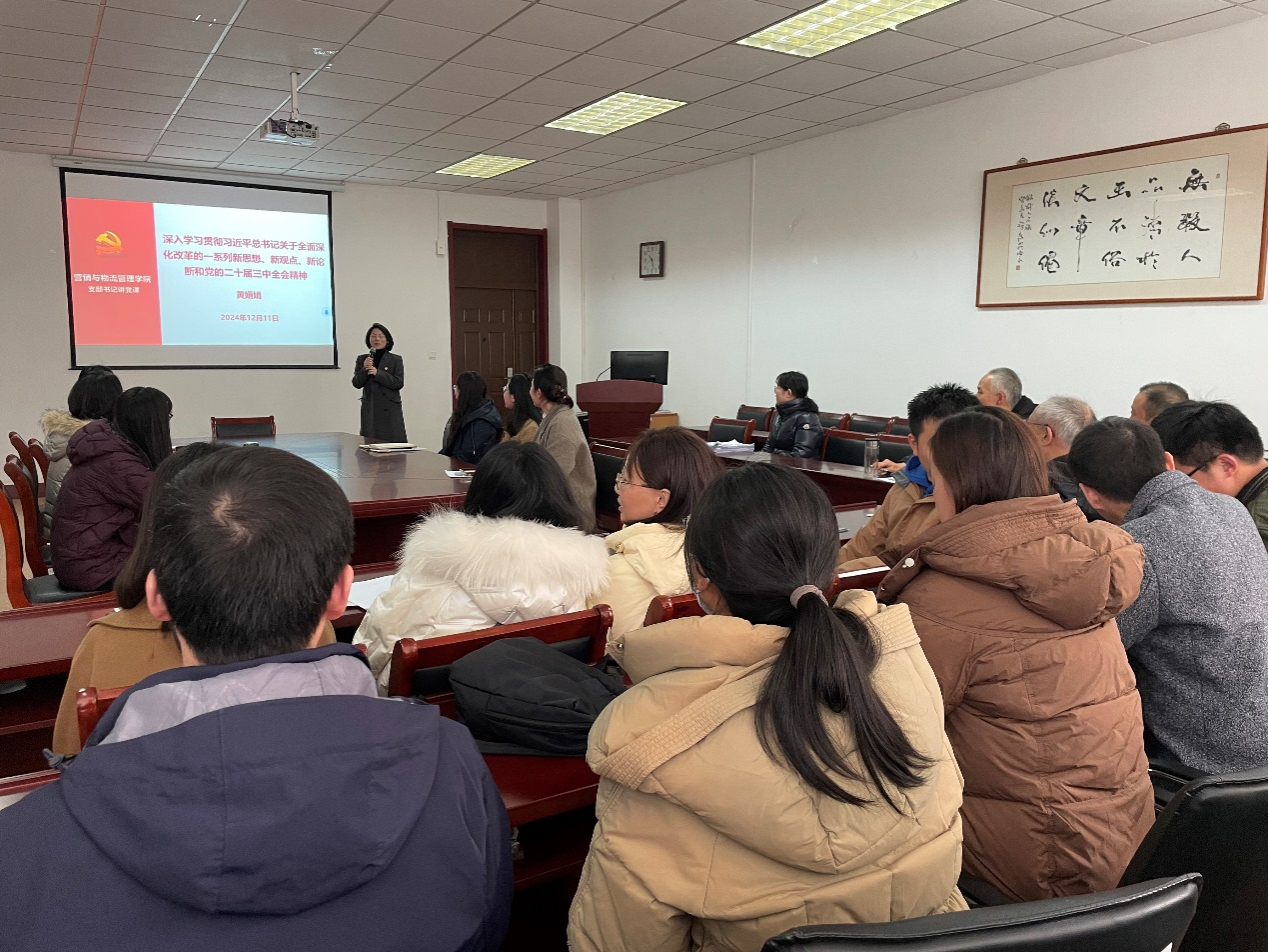12月11日下午,bevitor伟德国际1946教工党支部书记黄娟娟在德业楼407会议室主讲了一场以“深入学习贯彻党的二十届三中全会精神”为主题的党课,学院党委书记刘颖、党委委员姚杰、温欣及全体党员参加活动。