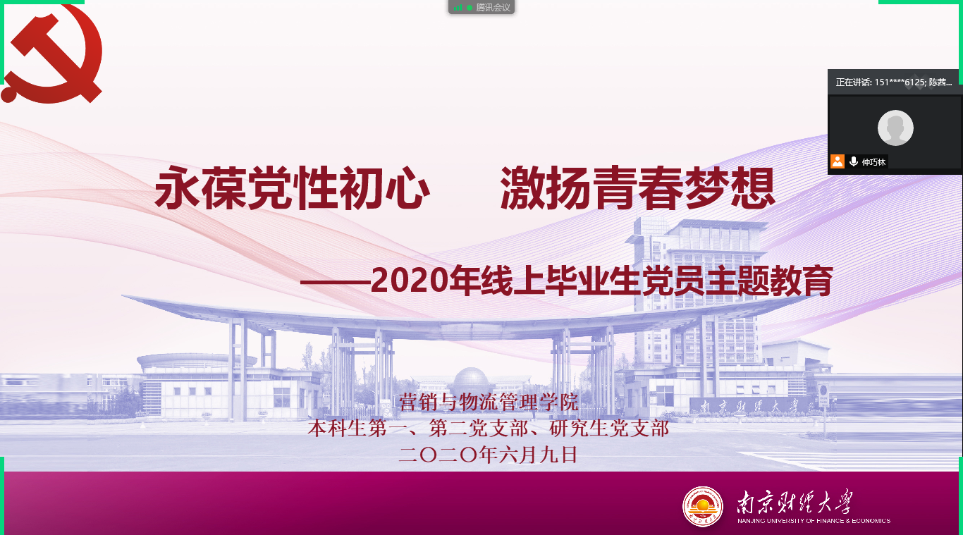 党委副书记张杰为毕业生党员线上讲授了“毕业时节话初心,建功立业担使命”微党课,她结合习近平总书记2020年5月3日向全国各族青年的寄语,表达了对全体党员的深切期望:一是要坚定政治信仰,永远对党忠诚,坚定不移跟党走;二是全体党员要肩负党的光荣职责,为党和国家事业发展作出更大贡献;三是更好地传承南财精神、坚持理论学习、立足岗位奉献。