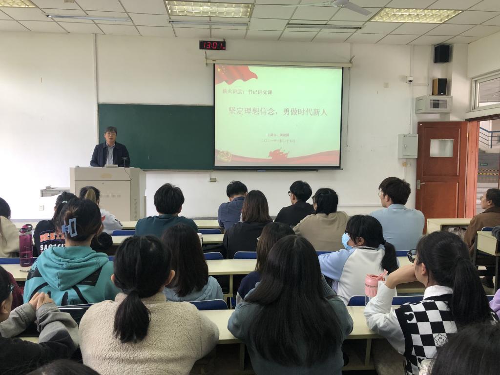 “心有所信,方能行远。面向未来,走好新时代的长征路,我们更需要坚定理想信念、矢志拼搏奋斗。”黄书记借用习近平总书记在给复旦大学《共产党宣言》展示馆党员“星火”志愿服务队全体队员回信引出了党课的主题。接着从回答“理想信念是什么”,到阐述“为何要坚定理想信念”,再到解答“如何坚定理想信念”,带领大家一同学习、领会了党的十八大以来,习近平总书记多次在不同场合对理想信念进行的深入阐释。他强调我们青年学生要牢记总书记的讲话,坚持学而信、学而思、学而行,把学习成果转化为不可撼动的理想信念,转化为正确的世界观、人生观、价值观,用理想之光照亮奋斗之路,用信仰之力开创美好未来。