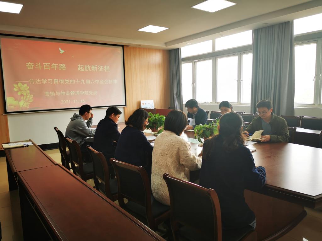 黄建国书记首先传达了《中国共产党第十九届中央委员会第六次全体会议公报》《中共中央关于党的百年奋斗重大成就和历史经验的决议》以及习近平总书记的重要讲话精神,并以“不忘初心、砥砺奋斗”为主题进行了学习体会分享。他表示,党的十九届六中全会审议通过的《中共中央关于党的百年奋斗重大成就和历史经验的决议》,全面总结了党的百年奋斗重大成就和历史经验,是郑重的历史性、战略性决策,充分体现党牢记初心使命、永葆生机活力的坚强意志和坚定决心,充分体现党深刻把握历史发展规律、始终掌握党和国家事业发展的历史主动和使命担当,充分体现党立足当下、着眼未来、注重总结和运用历史经验的高瞻远瞩和深谋远虑。作为党员干部,要认真组织全院师生开展专题学习,着眼新时代、新使命任务,以政治建设为统领,更加紧密地团结在以习近平同志为核心的党中央周围,始终鼓起“闯”的勇气、激发“拼”的劲头、保持“实”的干劲,把党的十九届六中全会精神和党中央各项决策部署落到实处,解放思想、改革创新、担当实干,提升服务能力,用心、用情、用力为师生解决难题,为建设高水平财经大学贡献自己的一份力量,以优异成绩迎接党的二十大召开,在新时代新征程上赢得更加伟大的胜利和荣光。