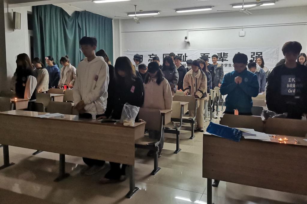 内场活动于18:30在博文楼211教室举行。首先同学们观看了影片《南京!南京!》,在观影过程中,不少同学的心一直压抑着,握紧了拳头却只能默默松开,有无奈但更多的是反思。与此同时,同学们点燃了一束束烛光,祈愿和平,寄托哀思。接着,同学们在负责人的组织下折起了千纸鹤,小小千纸鹤承载着的是在座同学的祝愿,一次次的对折、翻折包含着的是同学们对泱泱中华的无尽情思。最后,由负责人带领全体同学起立默哀,低下的头颅是为了缅怀那些同胞与英烈,挺直的脊背是对未来的责任与决心。