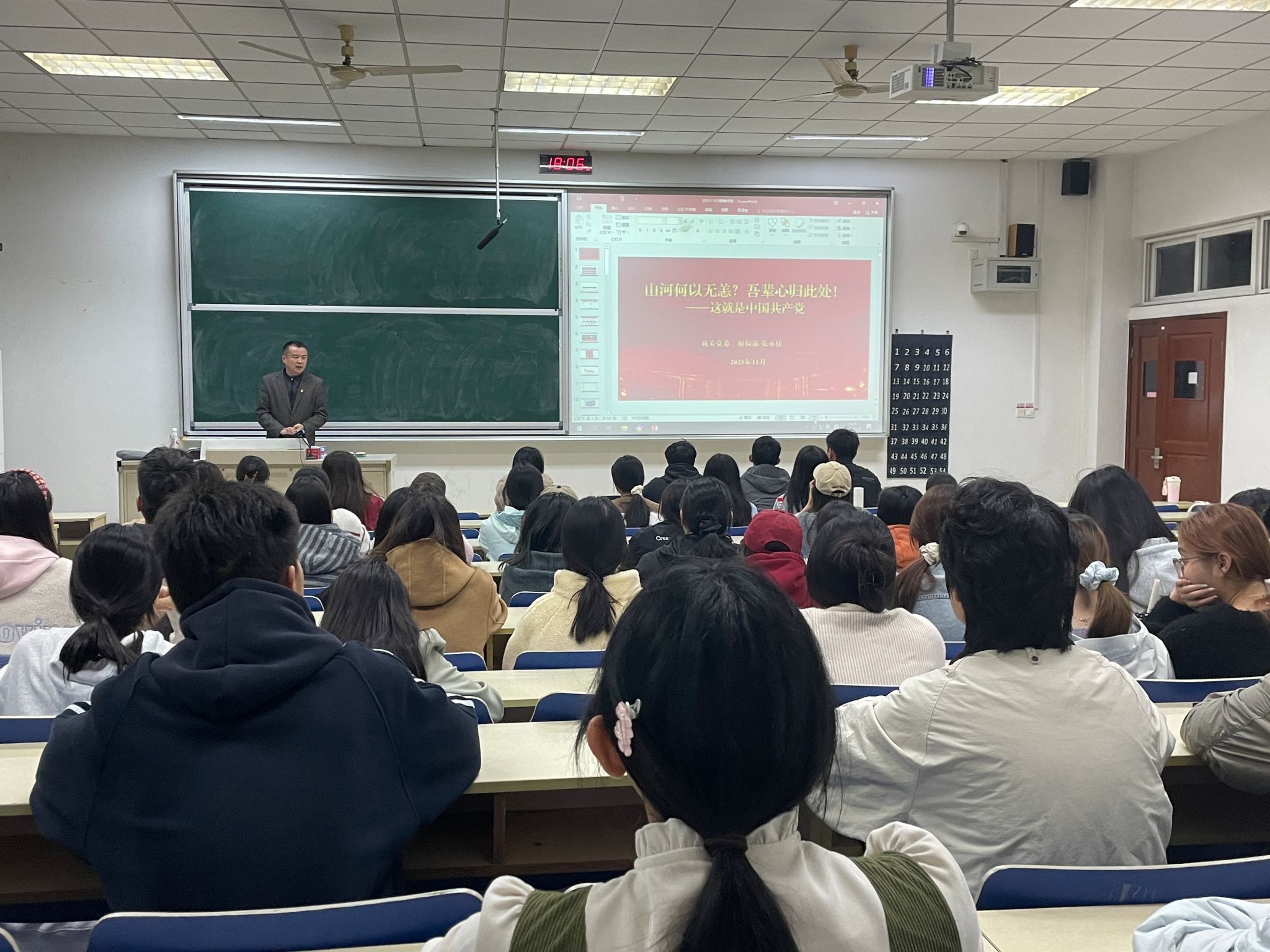 为深入学习贯彻党的二十届四中全会精神,11月3日晚,应bevitor伟德国际1946邀请,机关党委副书记(主持工作)、党委组织部副部长张亦佳老师,在德业楼111教室,以“山河何以无恙,吾辈心归此处”为题,为学院学生党员、党的发展对象和入党积极分子带来了一场深刻且生动的党课。