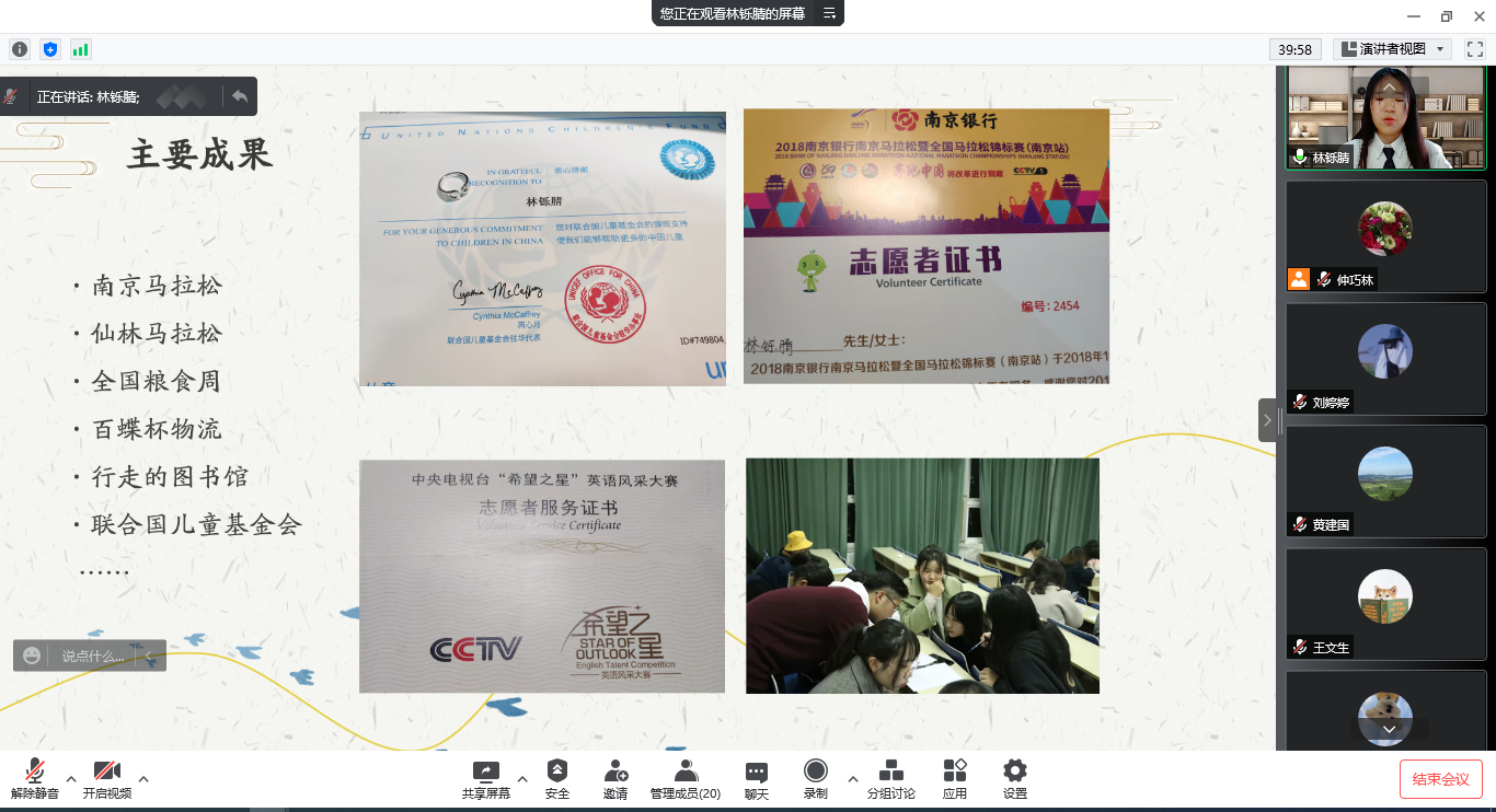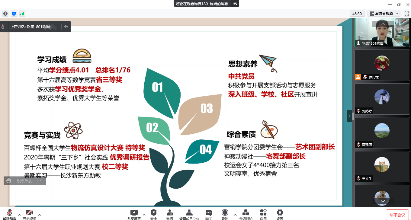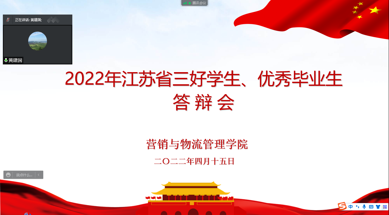 学院拟推荐江苏省三好学生1名、优秀毕业生1名。经前期个人申请、辅导员初评,共8名候选人进入线上答辩。答辩会上,同学结合精心制作的PPT详细进行了自我介绍,讲述入学以来在专业学习、学科竞赛、科研创新、志愿服务、社会实践等方面成绩,并分享了自己对生活的思考以及未来的展望。整个答辩过程充分展现了营管学子乐观自信、自觉奋斗的青春风采,也给评委和观摩的同学留下了深刻的印象。