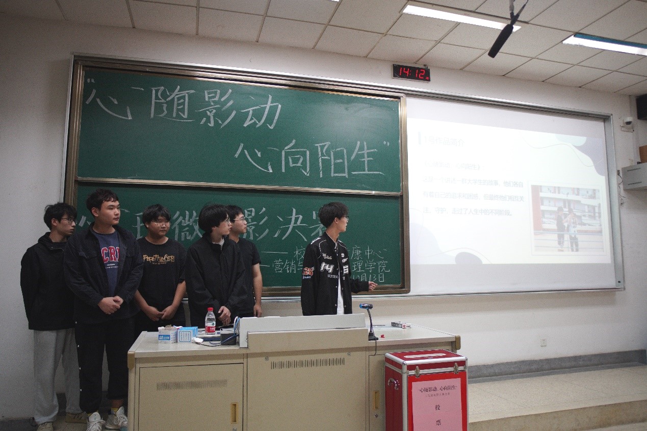 决赛现场,主持人介绍本次活动面向全校征集优秀微电影作品,经过层层筛选,最终有6支团队脱颖而出进入决赛,作品以反映大学生日常生活、学习、人际交往等方面所折射的心理现象为主题,内容丰富、情节深刻。评委老师对每部作品都做出讲解与点评,间接帮助同学们解决生活中遇到的心理问题,引导同学们在大学迷茫生活中做出选择。最终,通过专业评委、大众评委现场逐一观影后进行无记名打分投票,最后评选出