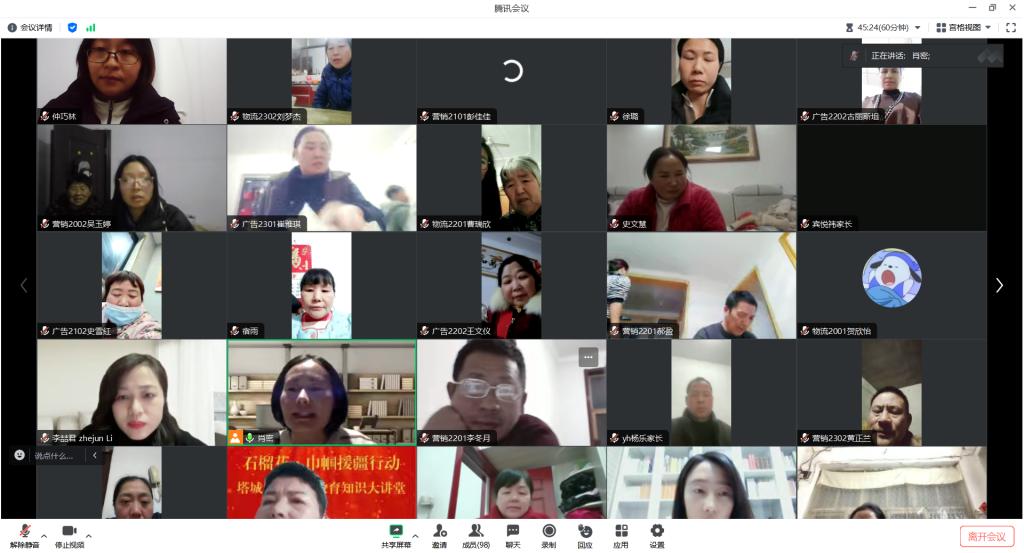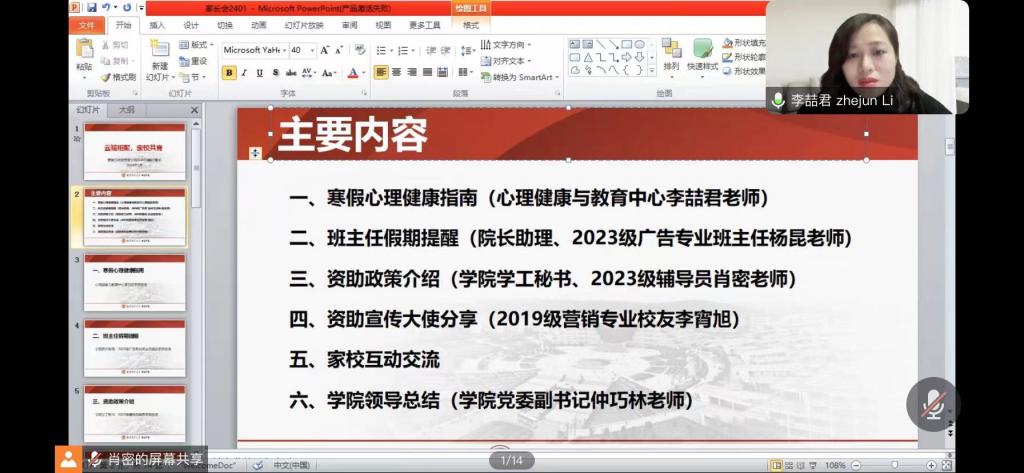 为持续凝聚育人合力,宣传国家资助政策,增强资助育人实效,1月28日晚,我院召开2024年寒假家庭经济困难学生线上家长会。学院党委副书记仲巧林老师,校心理健康与教育中心李喆君老师,学院院长助理、2023级广告专业班主任杨昆老师,辅导员肖密、殷漫漫、徐辉、徐璐老师,2019级营销专业校友李宵旭同学,以及学院全体家庭经济困难学生和家长共同参会。会议由学工办主任肖密老师主持。