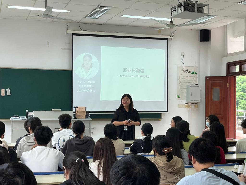 为帮助同学们明确未来的职业方向,4月28日下午,我院“萤光”生涯工作室于艺术楼205教室举办南财就创业讲堂——“就业引航,‘职’引未来”职业素养提升讲座。本次讲座邀请到江苏顺丰速运有限公司南京区人才生态供应链负责人涂娟娟担任主讲人,我院党委副书记仲巧林老师、辅导员肖密老师及大一同学参与本次讲座。