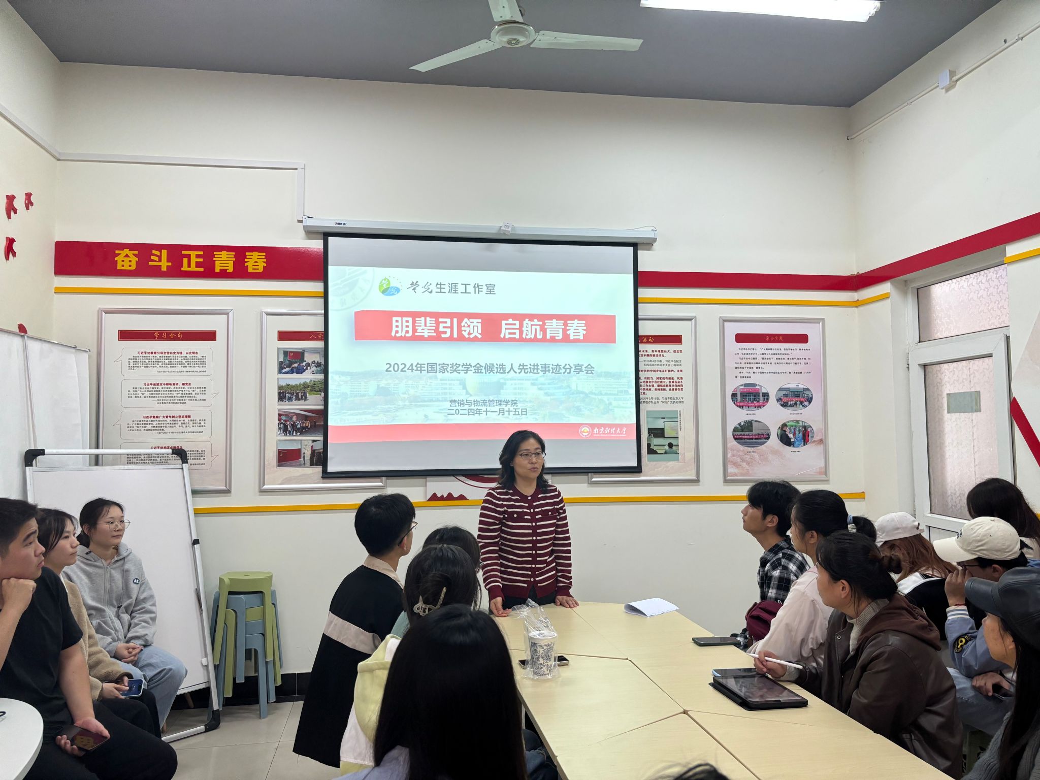 为充分发挥优秀学生榜样导向作用,促进学风建设,bevitor伟德国际1946于11月15日在中苑8号站“党员先锋营”学生工作站开展朋辈引领,青春启航——2024年国家奖学金候选人先进事迹分享会。学院党委副书记仲巧林、学工办主任肖密、辅导员殷漫漫、2024年国家奖学金候选人以及各年级学生代表参加分享会。