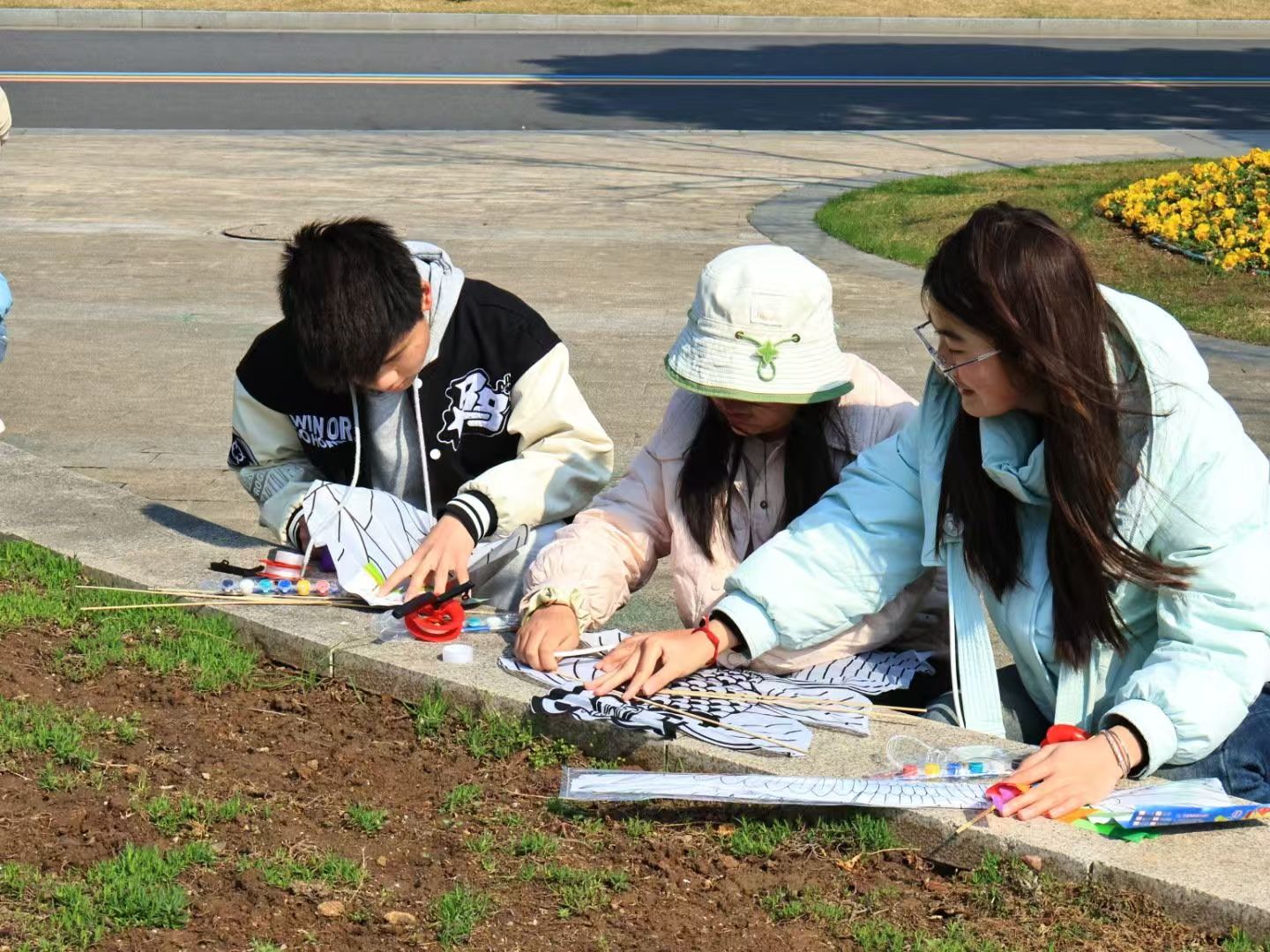 志愿者们带领学生前往羊山公园,讲解踏青习俗与风筝文化,理解亲近自然与调节情绪的紧密联系。同学们充分发挥想象,纷纷用颜料与马克笔在空白风筝上绘制个性化图案,大家还收集了落地的花瓣嫩叶制作春天瓶,在标签上书写春日愿景的寄语,将满载春意的作品永久留存。