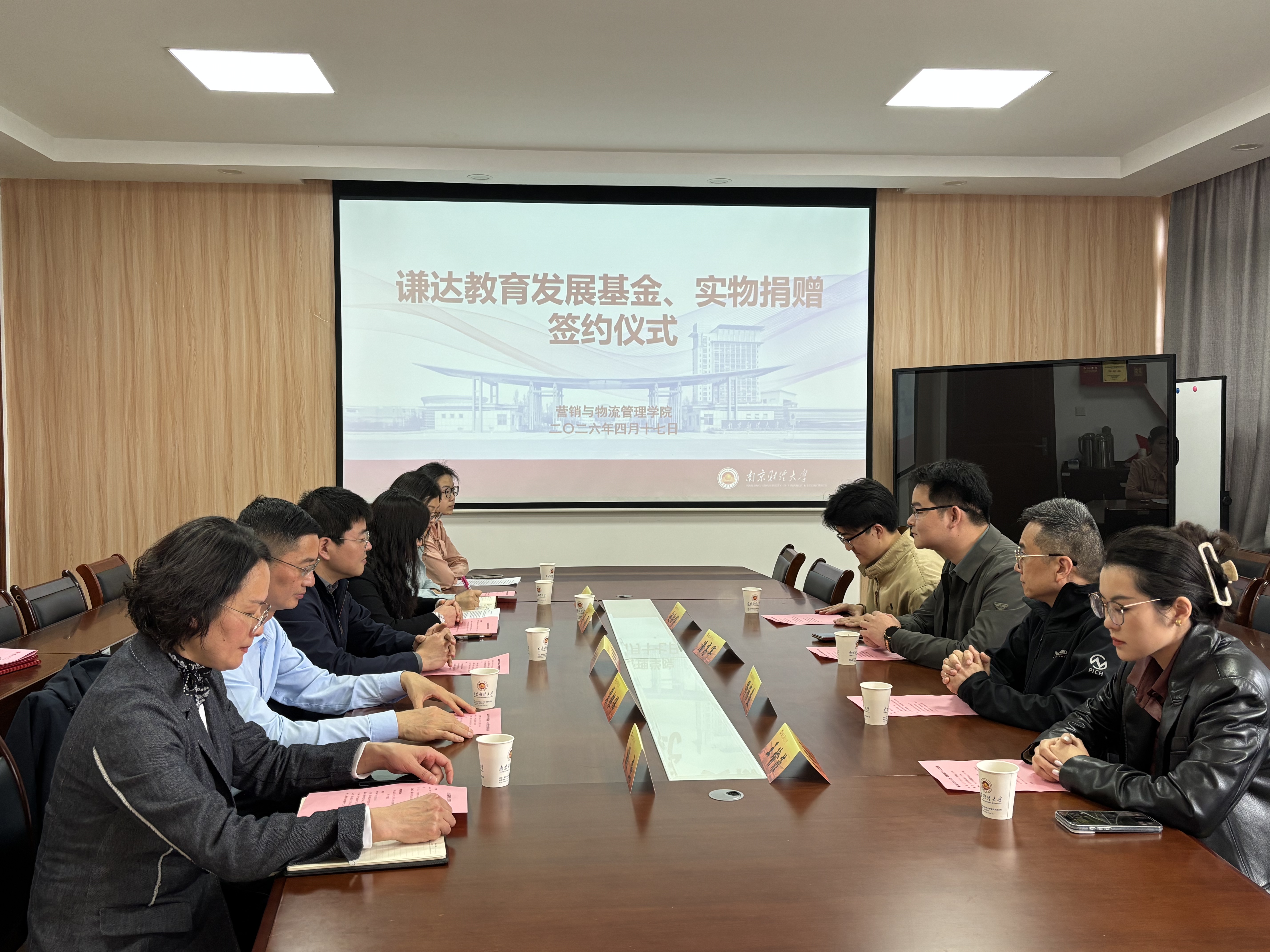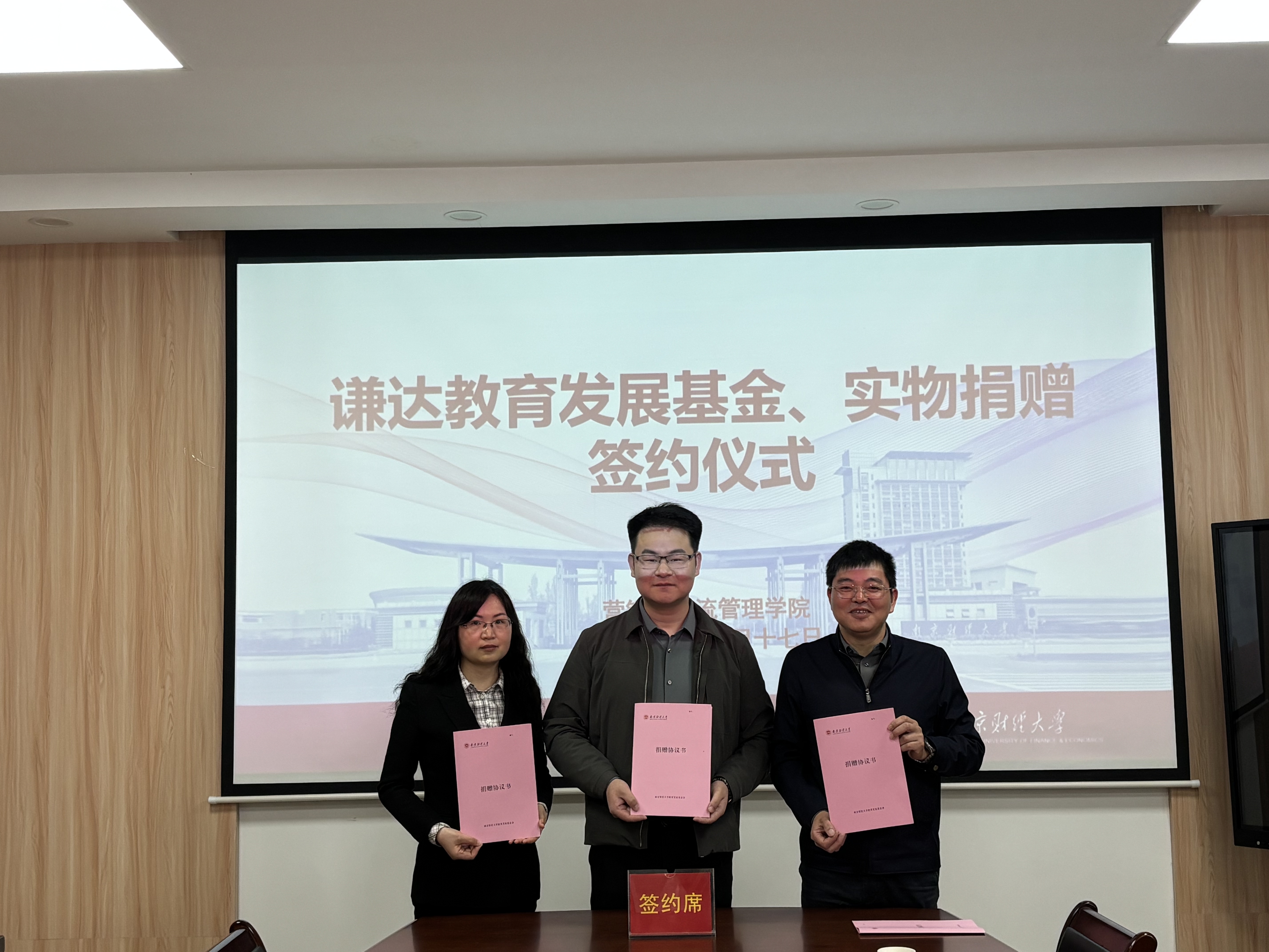 随后,三方代表共同签署捐赠协议,陆明峰处长向捐赠方颁发了捐赠证书。本次谦达教育捐赠的5万元发展基金及价值5500元的可移动会议电视一体机,将用于支持学院学生培养、优化教学与办公环境。