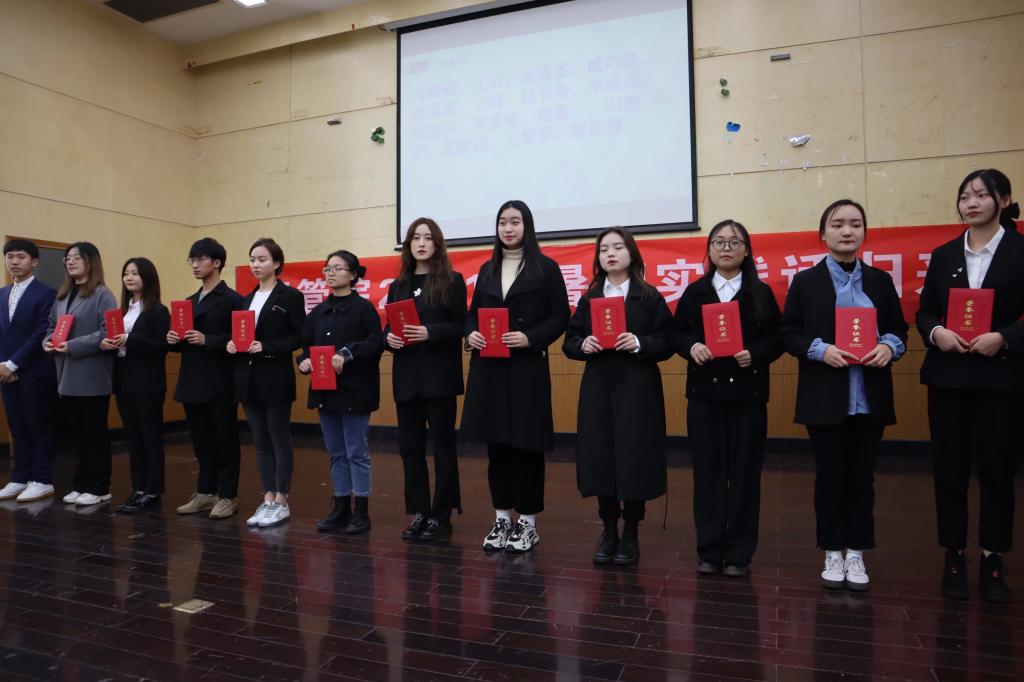 最后学生会主席团为获奖团队颁奖,获得一等奖的“红鲤鱼”实践团队,获得二等奖的是“绿区好汉”实践团,获得三等奖的是格物小分队、你们都不队、校园文化调查小组、微醺的小黍米、林夕小队。此外,“红鲤鱼”实践团队和新时代“绿区好汉”实践团荣获优秀团队称号。获得优秀调研报告称号的团队分别是:“红鲤鱼”实践团队和以“文”载“创”实践团队。接下来宣布的是先进个人荣誉的获得者:马舒筱、王洁、朱倩雯、臧巧菲、韩国薇、王珂、杜书菁、李成成、束国华、朱嘉敏、赵秦一、归懋容、童新元、王紫梦、陈欣慧。