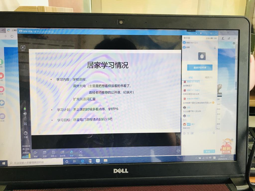 空中思政主题班会上,每一位同学都交流分享了自己疫情期间的学习计划和思想动态,同时也提出了学习和家庭生活中一些困惑和压力。辅导员根据对学生的长期观察,针对每位同学的差异性和不足之处都提出了建议。除此以外,辅导员还通过同学们对于疫情期间的人生感悟,有效引导学生厚植家国情怀、调节精神状态、深化生命教育、坚定战“疫”信心。