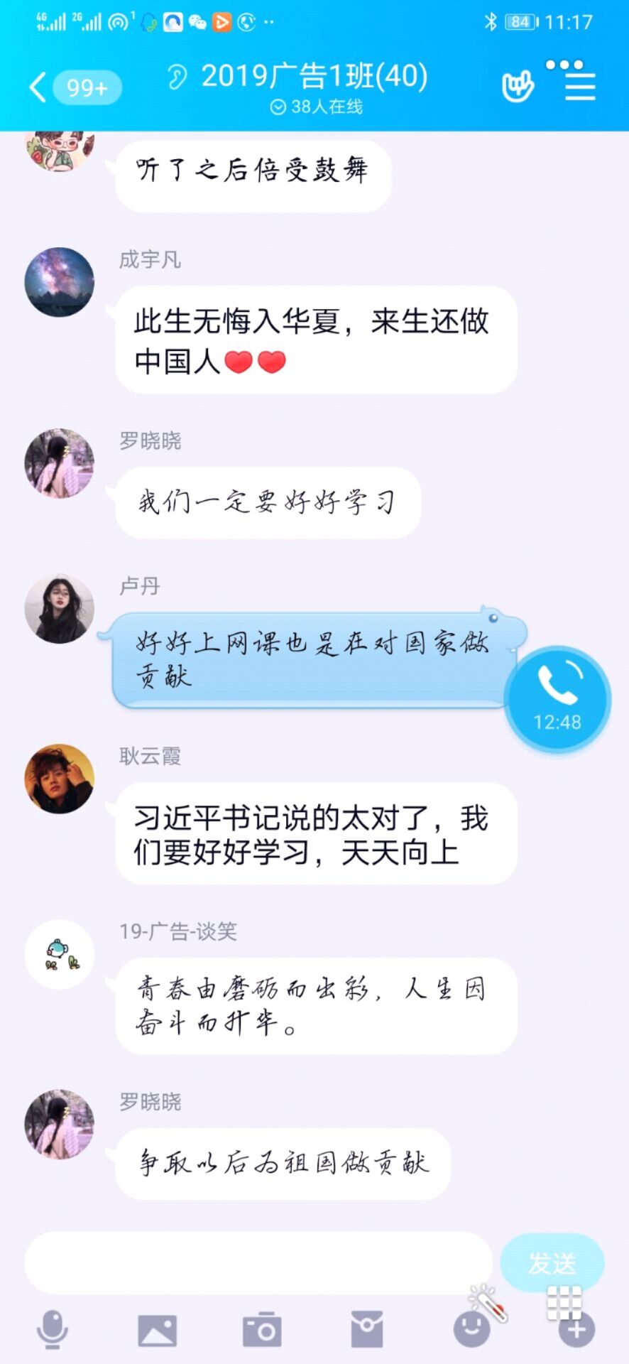 5月7日晚青年团干线上研讨会在腾讯课堂上开展。首先,研讨会主持人营销1901何小琳同学带领参会成员学习和解读习近平总书记对青年人的寄语。接着,优干主讲人广告1802卞倩对娄书记寄语和学校防疫工作中青年表现进行解读。最后,主持人带着参会人员一起重温了习近平总书记对青年的赞扬。会议期间,优秀团员、团干积极发言,交流互动,气氛热烈。此次研讨会中,优秀团员、团干认真学习并深刻体会到了习近平总书记和娄书记对青年的寄语精神,感受到了肩上的重担,并决心努力奋斗,展望未来。