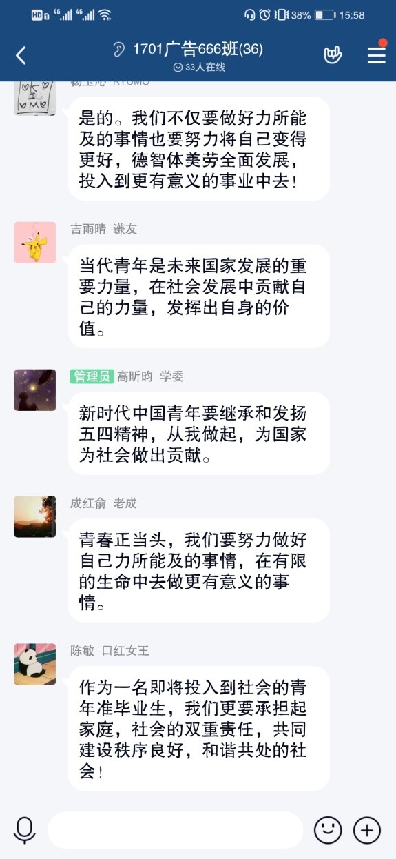 5月8日各个基层团支部广泛开展信仰公开课和主题团日活动,确保学习深入到每一个基层团支部、每一位团员青年。信仰公开课选取校2019年校青马班学员、优秀学生代表、抗疫志愿者为主讲人,同学们热议此次信仰公开课和主题团日活动,纷纷表示受益匪浅,身为财大的一份子,更应该传承五四精神,脚踏实地的奋斗,具有使命感和荣誉感,担负起时代责任和社会责任,用实际行动诠释和践行五四精神,在建设特色鲜明高水平财经大学的新征程中,奋力书写属于南财青年的青春华章!