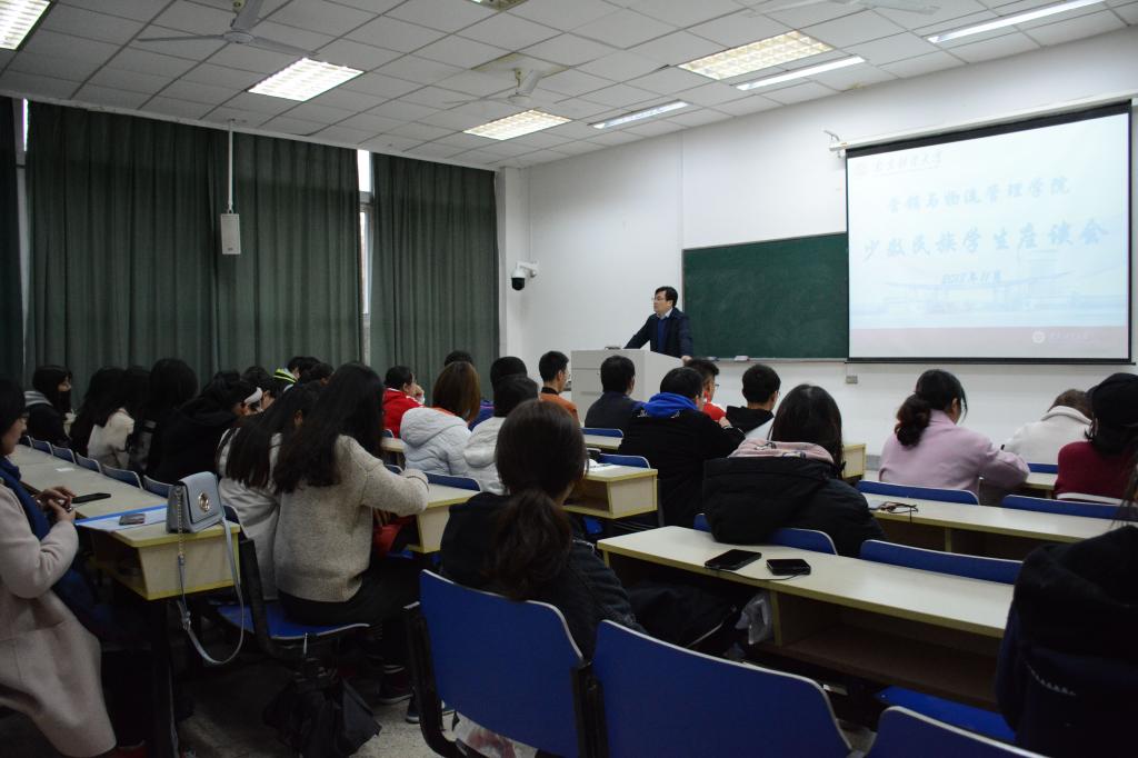 首先,仲巧林老师详细介绍了学校、学院关于少数民族学生相关帮扶政策,同时阐述了学院对少数民族学生的在学习生活上的具体执行方案。